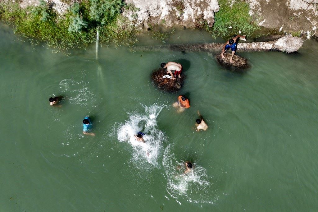 شباب يسبحون للتهدئة في مياه نهر الفرات العراقي خلال موجة حارة، في منطقة الهندية شرق كربلاء (7 حزيران 2024 - أ ف ب).