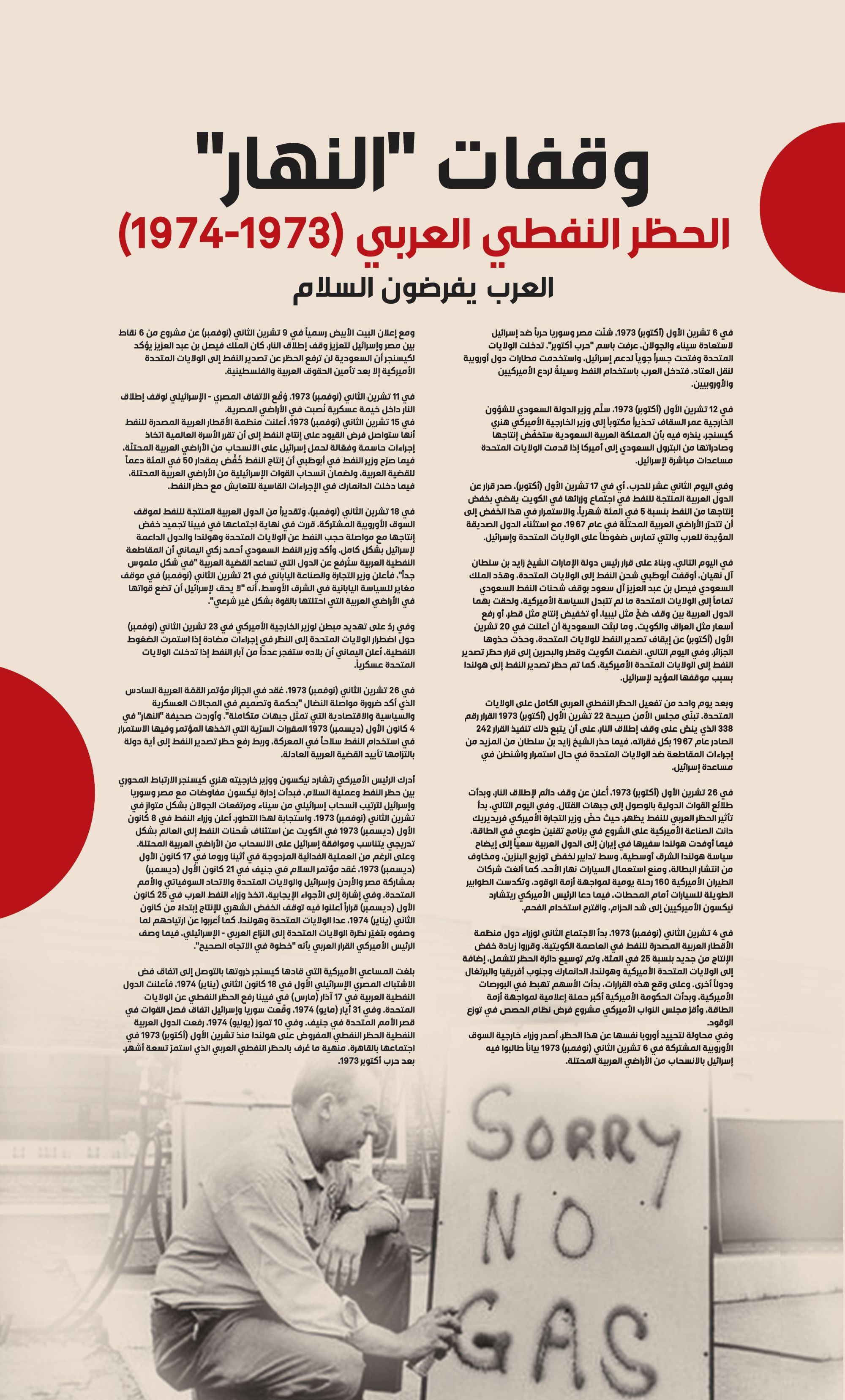 - 17 تشرين الأول (أكتوبر) 1973: قرار الدول العربية المنتجة للنفط في الكويت خفض إنتاجها من النفط بنسبة 5 في المئة شهرياً، واستمرار خفض الإنتاج إلى أن تتحرر الأراضي العربية المحتلة في عام 1967.