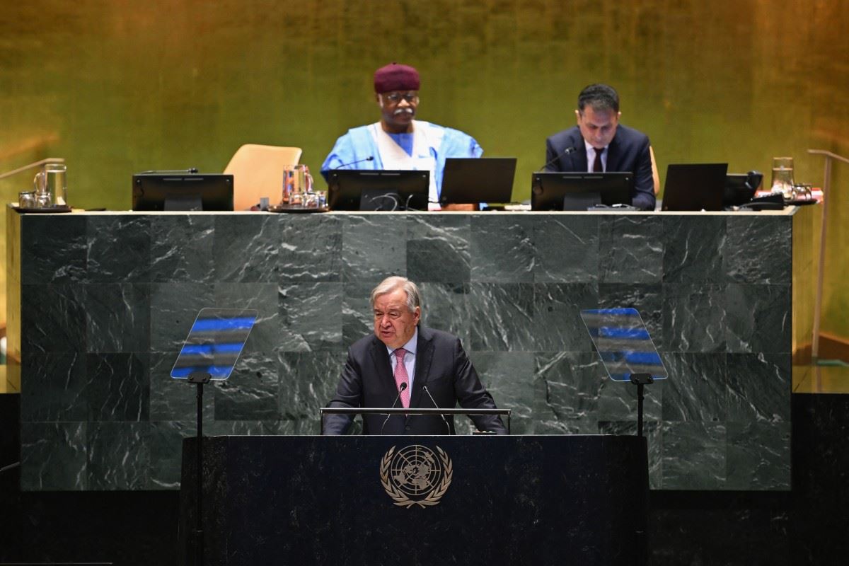 غوتيريس متكلما خلال "قمة المستقبل" على هامش الجمعية العامة للأمم المتحدة في مقر الأمم المتحدة في نيويورك (22 ايلول 2024، أ ف ب).