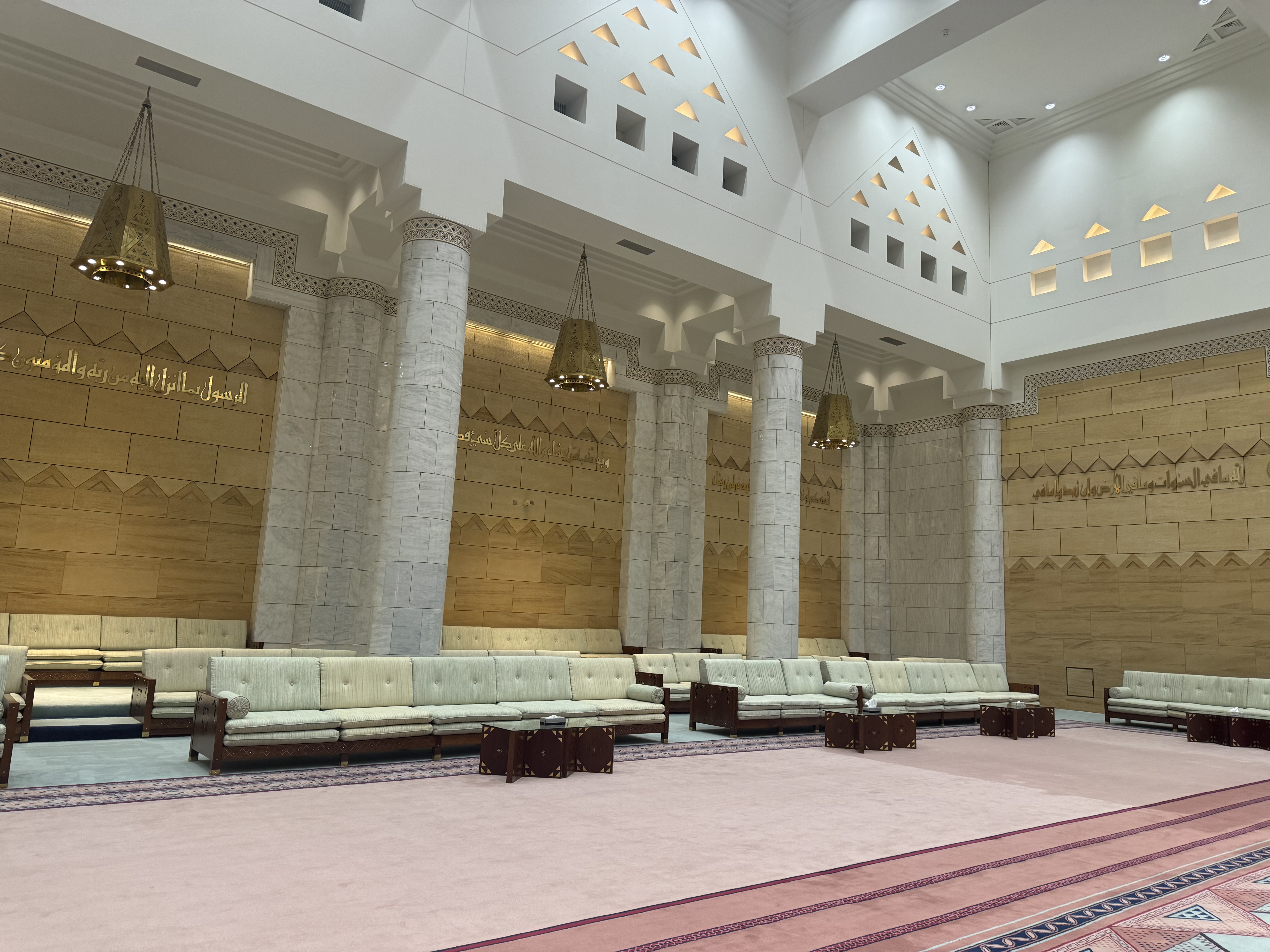 وتبلغ مساحة مجلس البيعة 2000 متر مربع، وارتفاعه 14 متراً، ويوجد على جانبيه صفوف من الأعمدة المغطّاة بالرخام، فيما زيّنت جدرانه بزخارف ونقوش على الطراز المحليّ.