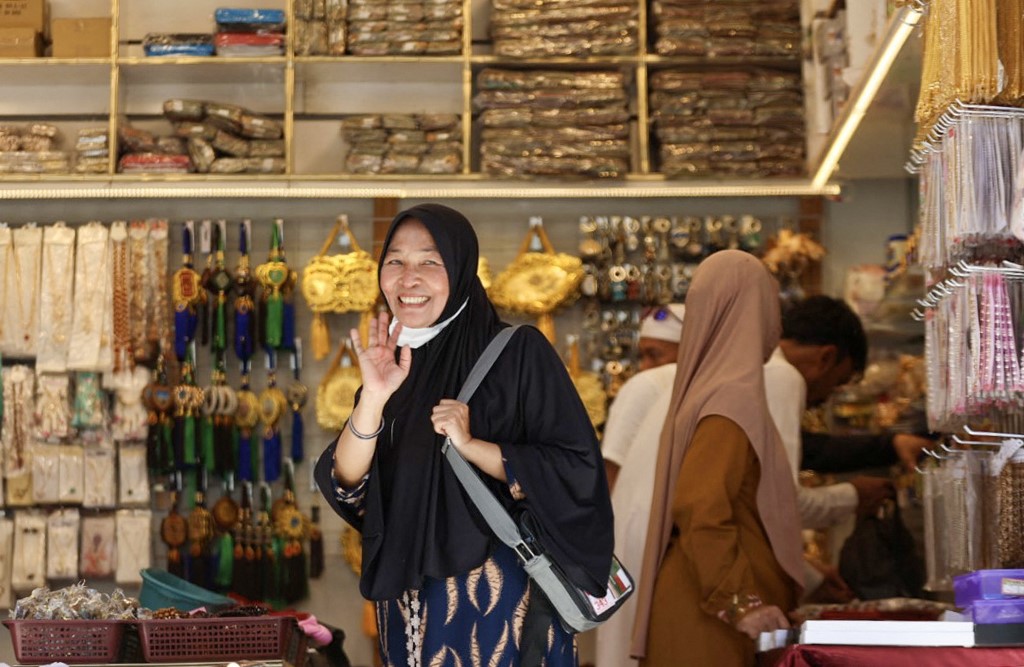 ينادي الباعة على بضاعتهم بينما يقف رجال ونساء يقلّبون في السُبح وسجاجيد الصلاة والملابس والعطور لشراء الهدايا لأحبائهم أو حمل التذكارات من الأراضي المقدسة.
