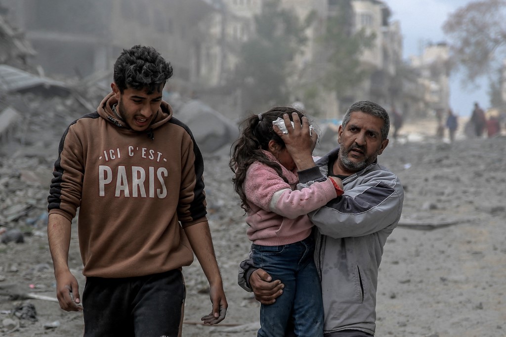 امرأة فلسطينية تحتضن طفلاً جريحاً بعد القصف الإسرائيلي على وسط مدينة غزة (18 آذار 2024 - أ ف ب).