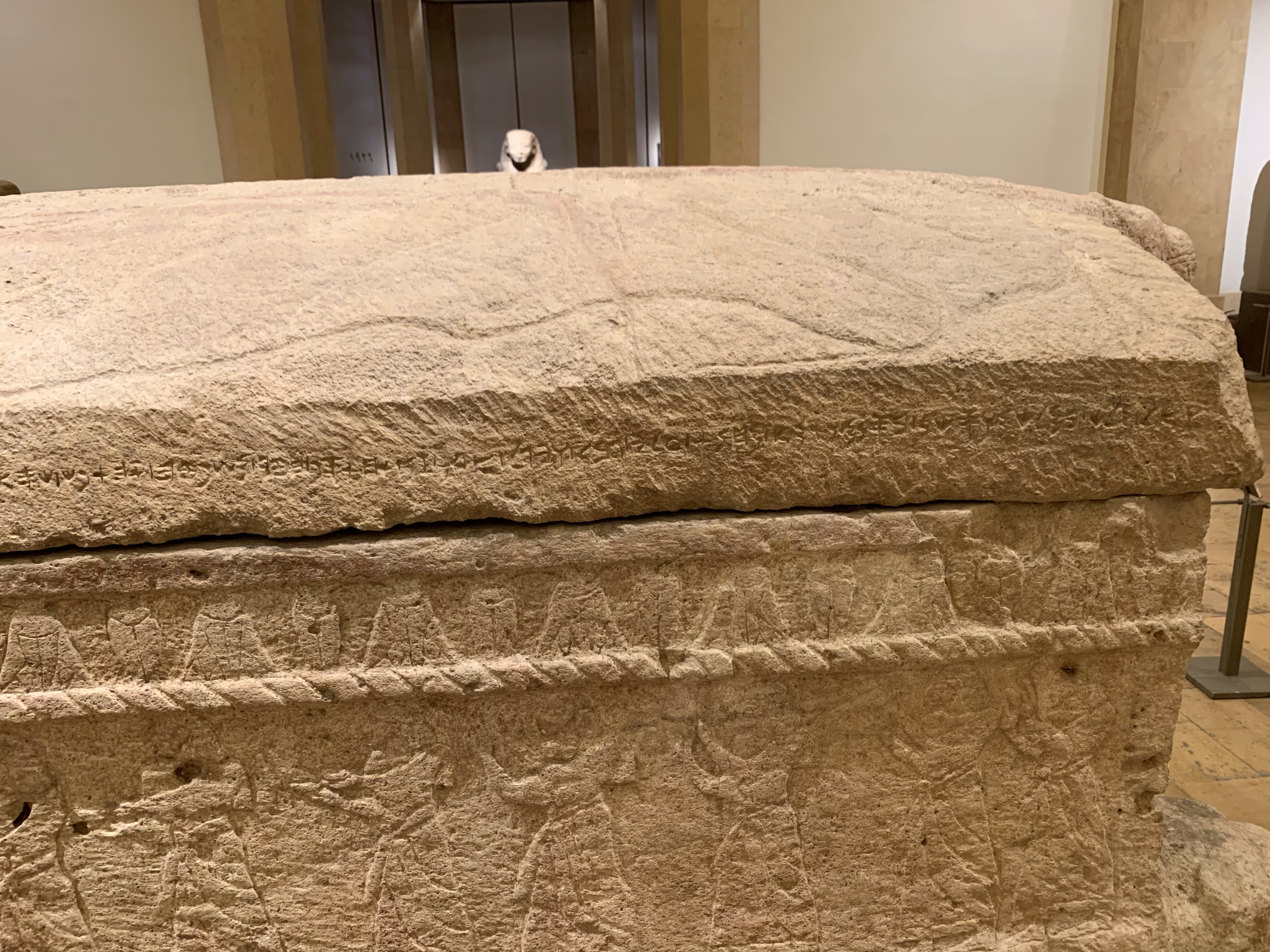 يظهر النص المكتوب بالأبجدية الفينيقية في الطرف الأعلى من جرن الناووس. وتحت النص يوجد نقش يمثّل أربع نساء متدليات الثياب على الخواصر، يلطمن صدورهن أو ينتفن الشعر حزناً وتعبيراً عن الأسى العميق. يشير هذا النص إلى أن الناووس تم صنعه من قبل أتوبعل، ابن الملك أحيرام من جُبَلْ (جبيل)، لوالده، ليبقى منزله إلى الأبد.
