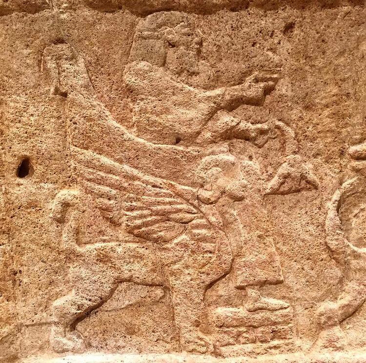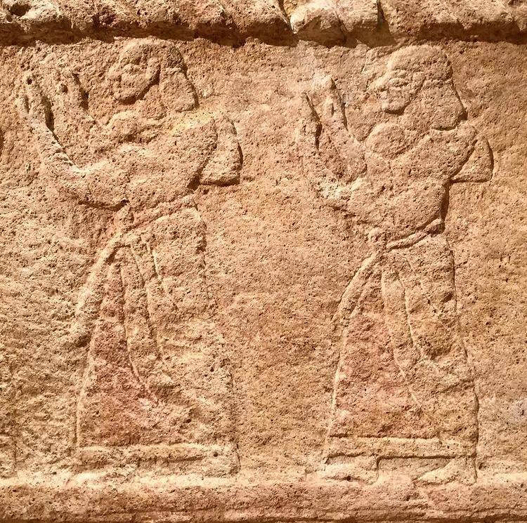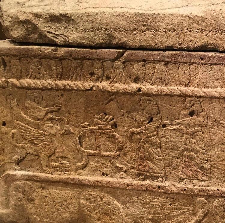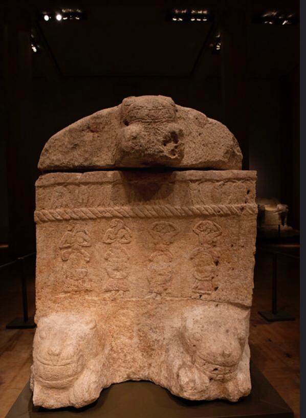 ويظهر الأشخاص وهم يحملون الهبات، ويرفع بعضهم الآخر يديه للصلاة. كما ويزدان أعلى الجرن بتوالي براعم زهرة اللوتس، واحد منفتح وآخر مطبق، إشارة إلى تعاقب الحياة والموت. ويستند الجرن إلى أسود رابضة متدابرة نافرة الرؤوس والأيدي.