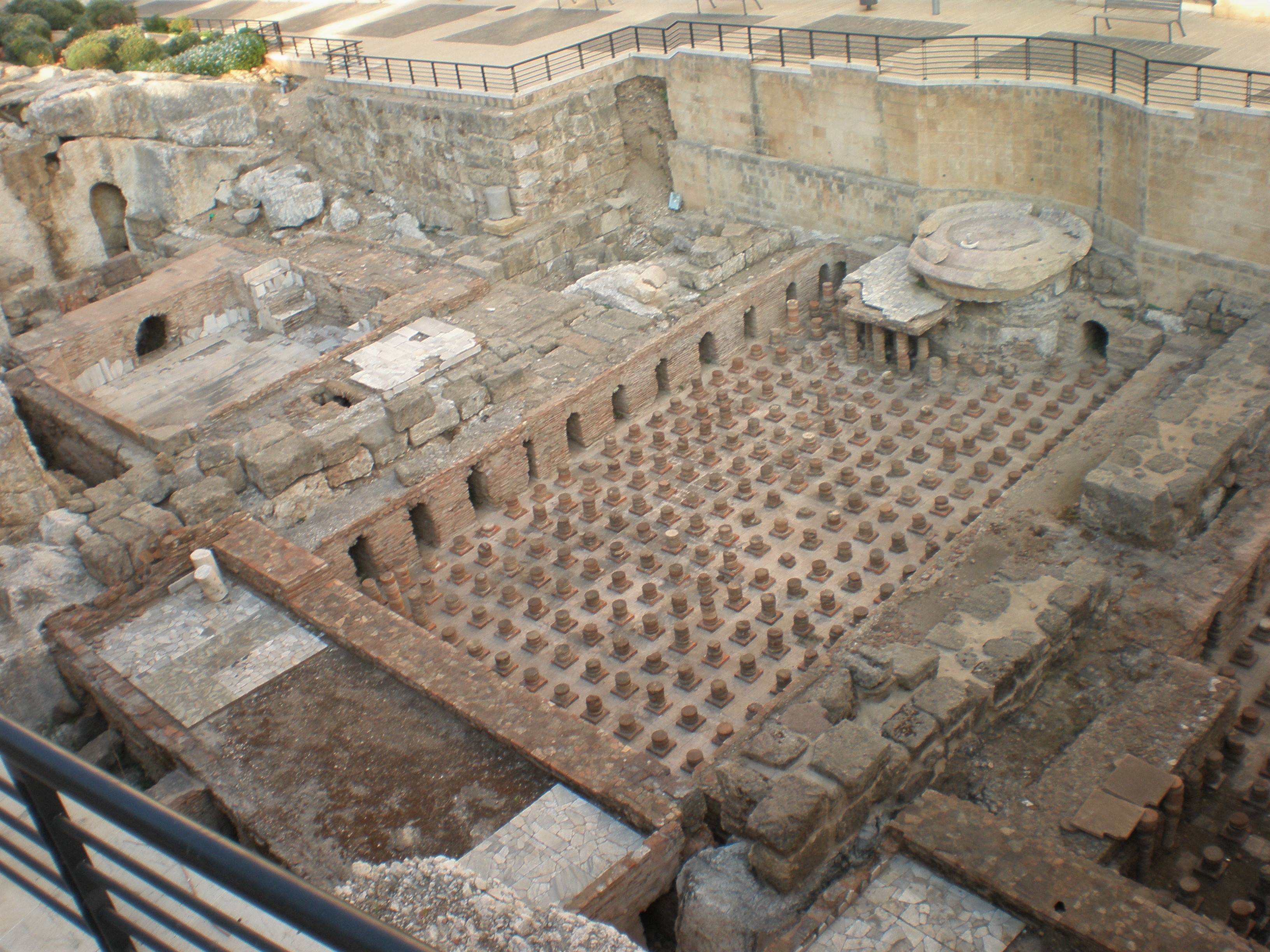 كان يوزّع الهواء الدافئ داخل أرجاء الحمّام من خلال القناطر التي تسمح بمرور الهواء، والأعمدة الفخارية والأسطوانات المجوّفة المتعددة الأضلاع أو الدائرية. كانت ترصف الأرضيات ببلاطات مربّعة طولها 60 سم، ثم تغطّى بالفسيفساء المزخرفة.