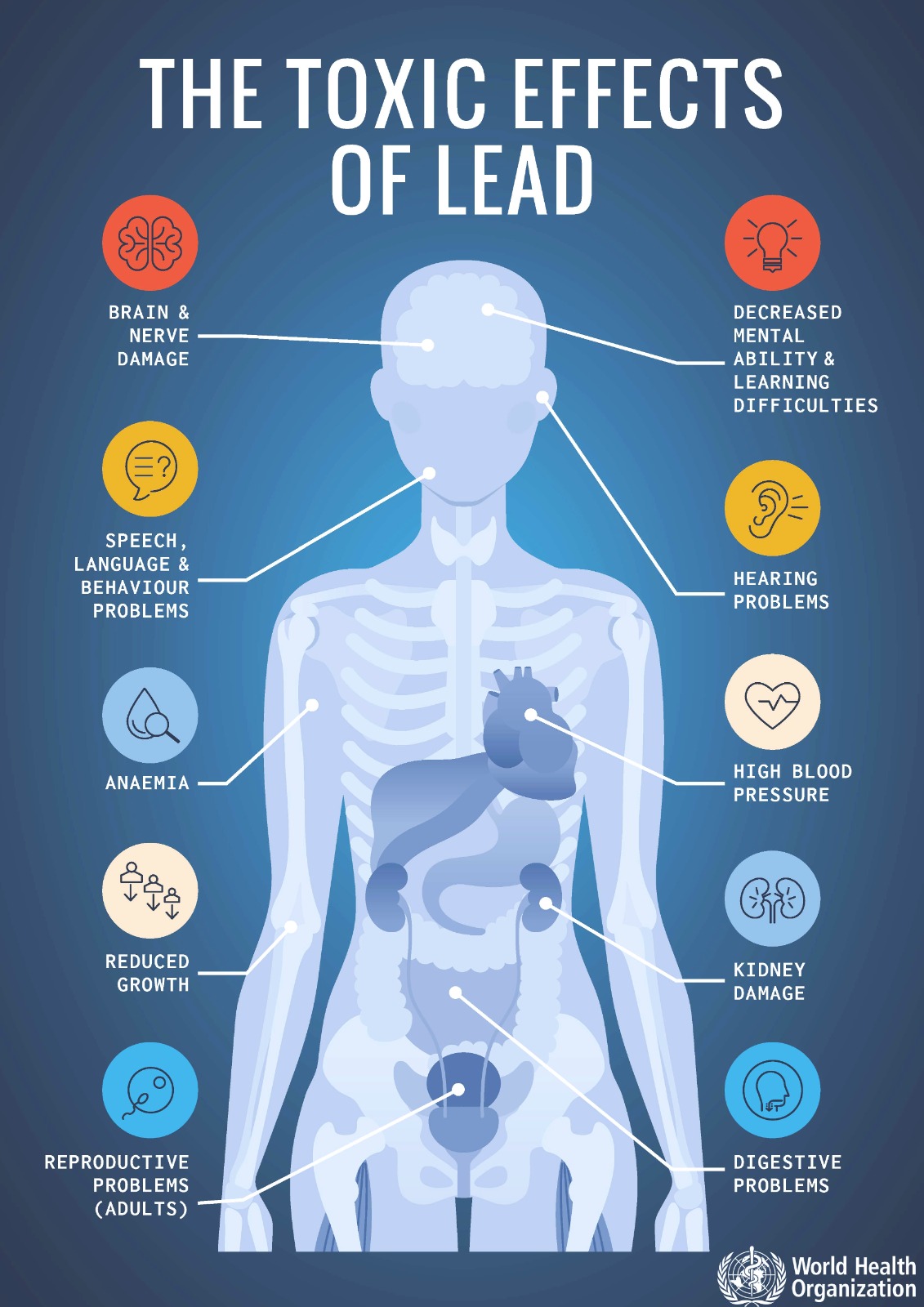 ويقدّر تحديث منظمة الصحة العالمية للعام 2021 تأثير المواد الكيميائية على الصحة العامة بما يقرب من نصف مليون شخص فقدوا أرواحهم العام 2019 بسبب التعرّض للرصاص.