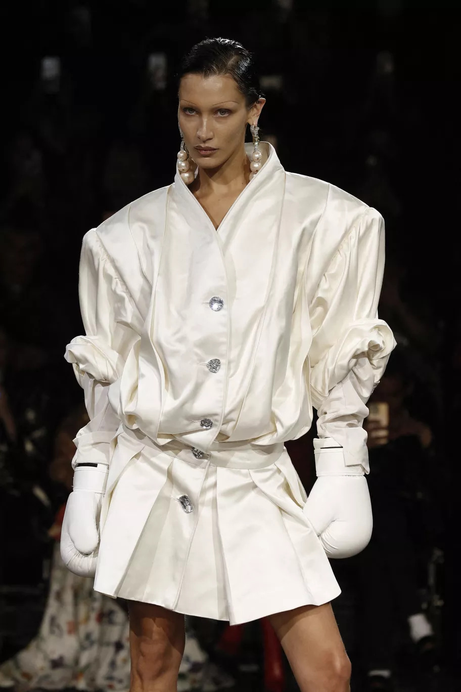 نيويورك ولندن وباريس وميلانو... رأيناها على منصّات العرض في موسم ربيع وصيف عام 2023. قادت عارضة الأزياء الأميركيّة ماراتون الإطلالات الخاصّة بها ببراعة وإتقان. خلال ختام عرض أزياء كوبرني في 30 أيلول، جذبت عارضة الأزياء أنظار الجمهور إليها على البوديوم. قام رجلان برش محلول تماسك فورًا عند ملامسته جلد العارضة الشهيرة ليشكّل طبقة من القماش غير المنسوج. العرض المبتكر لم يتم التدرّب عليه. بعد هذا الأداء التاريخي، أحدثت بيلا حديد ضجة كبيرة في مركز بومبيدو يوم 3 تشرين الأول في عرض ستيلا مكارتني. خلال مرورها الأوّل على المنصّة، ارتدت الأخت الصغيرة للعارضة جيجي حديد جمبسوت شفّافاً بلون النيود مطلوساً بالترتر، يكشف عن صدرها.