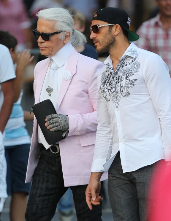 مصمم الأزياء الشهير مدين بالفعل بعدد كبير من فواتير الضرائب غير المدفوعة. كارل لاغرفيلد يسير مع سيباستيان جوندو، مساعده وملهمه، في شوارع سان تروبيه، 13 تموز 2013.