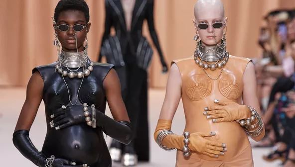لطالما كان جان بول غوتييه حريصًا، خلال مسيراته، على إظهار الأجساد بكل تنوّعها. لم يكن عرض الأزياء الراقية لخريف وشتاء 2022-2023، الذي صممه أوليفييه روستينغ، استثناءً من القاعدة. بعد Chitose Abe وGlenn Martens، دعي المصمم الشاب لدار Balmain لتولّي زمام الدار الباريسي لمدة موسم: تقليد وضعه جان بول غوتييه بعد تقاعده من الموضة في عام 2020. ومن بين 59 زياً، تخيّل أوليفييه روستينغ فستانين يحتفلان بجسد المرأة الحامل.