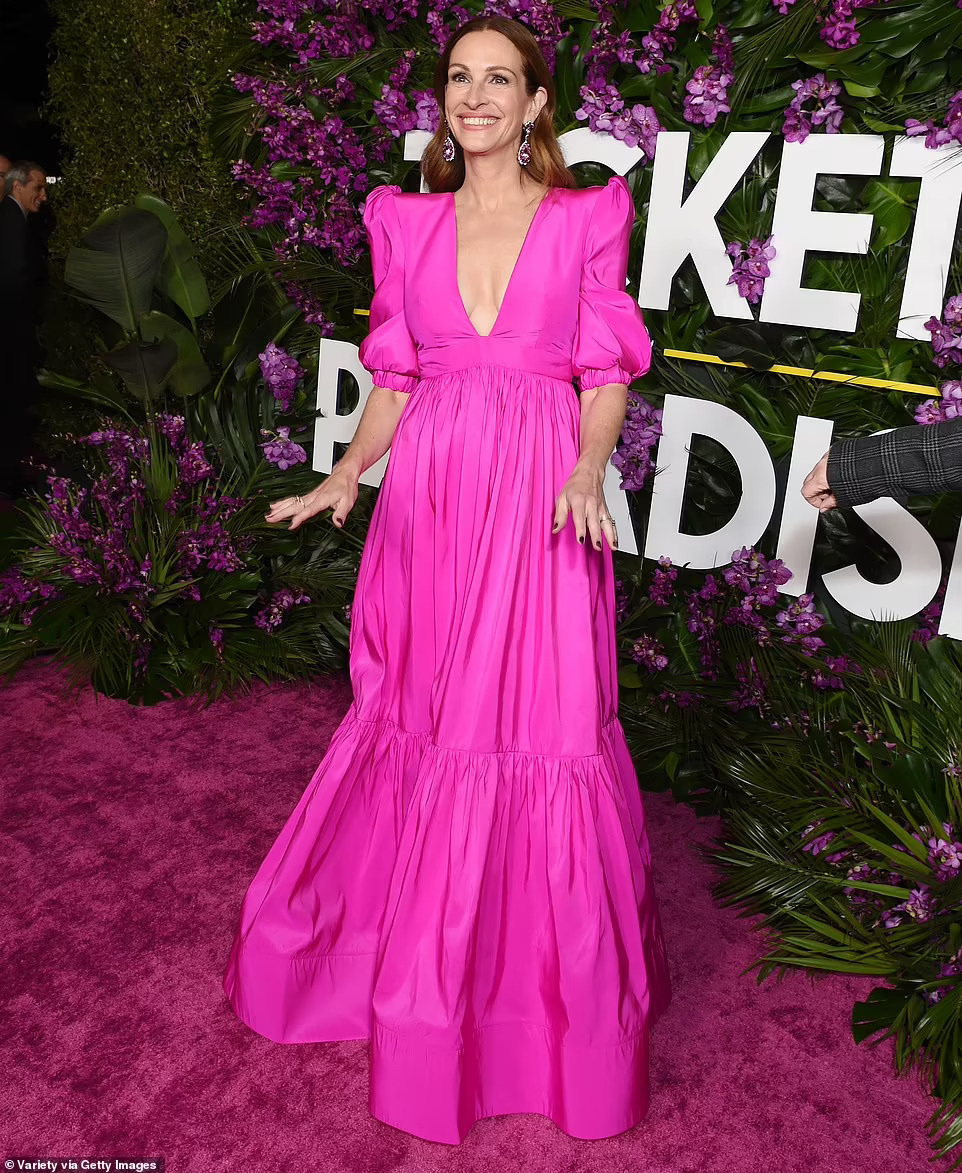 جوليا روبرتس بفستان من توقيع Greta Constantine ومجوهرات Chopard وحقيبة كلاتش من توقيع Tyler Ellis.