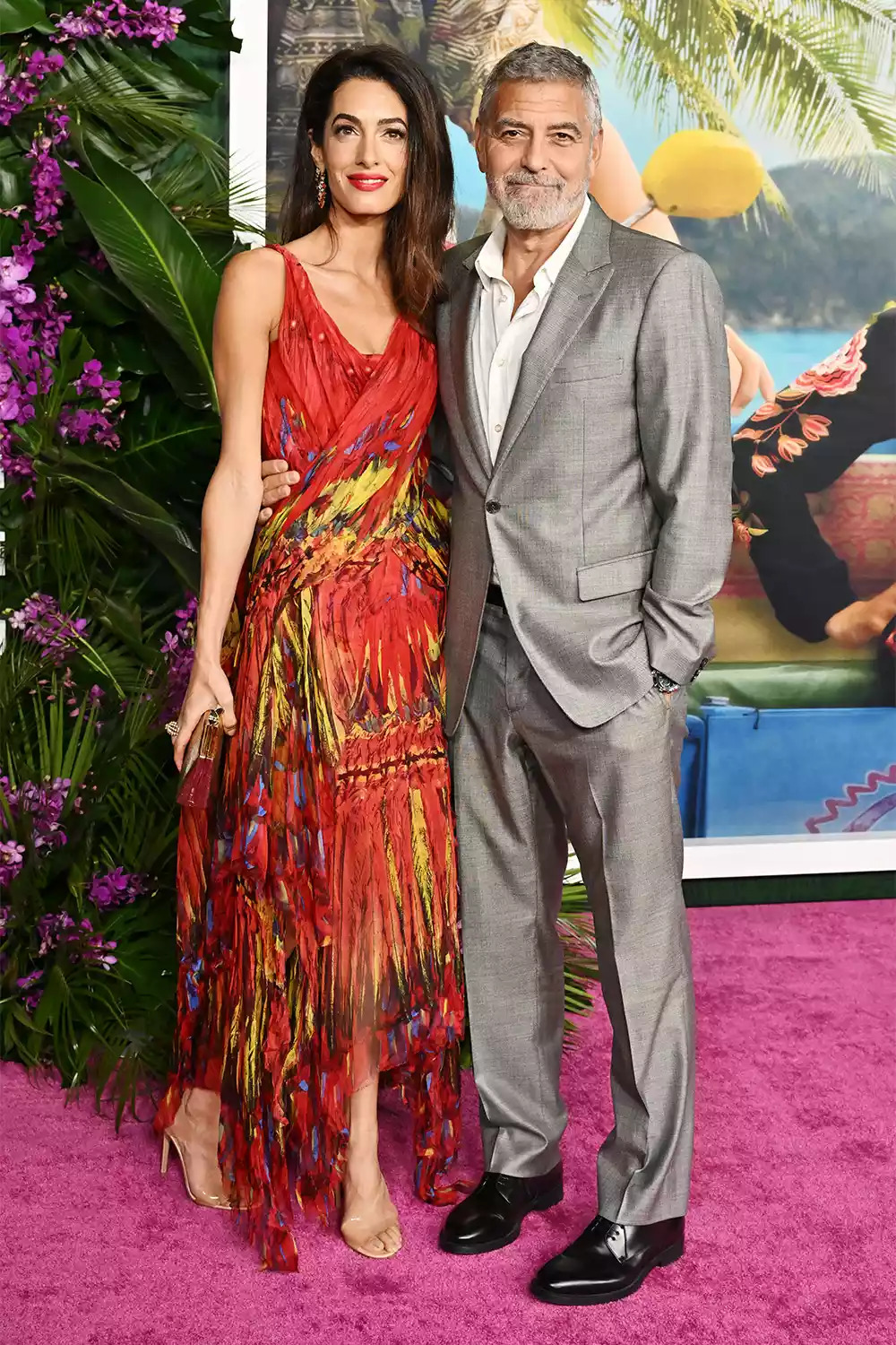 ارتدى جورج بذلة فضيّة بينما اختارت أمل المذهلة لونًا من البوب، ينتمي إلى مجموعة ألكسندر ماكوين لربيع 2023. فستان نابض بالحياة بألوانه الأحمر والأصفر والأزرق، ومن دون أكمام، وقد زيّنته طبعات تُحيل على الفنّ المعاصر، ونُفّذ بقماش الشيفون. تميّزت التنورة بالثنيات، وزيّن الكورساج بالدرابيه، مضيفًا جمّاليّة الكوتور إلى الفستان. تنقّلت الفاتنة ذات الأصل اللبناني بحذاء البرسبيكس المفتوح على الأصابع، وبالكعب النيود من توقيع Gianvito Rossi. كان الحذاء إضافة مثاليّة، فجذب الانتباه إلى الفستان. وأكملت إطلالتها بزوجين من الأقراط المتدلّية باللونين الأحمر والذهبي. لإضفاء لمسة لونيّة إضافية، وضعت أمل أحمر شفاه أحمر نابضاً بالحياة ليتوافق مع نظام ألوان فستانها. تمّ اعتماد فرق جانبيّ في شعرها البنّي ليسقط فوق كتفيها بتموّجات طويلة وأنيقة. بلغ سعر فستان أمل كلوني 11000 جنيه استرليني، أمّا حذاؤها فبلغ ثمنه 555 جنيهاً استرلينيّاً.