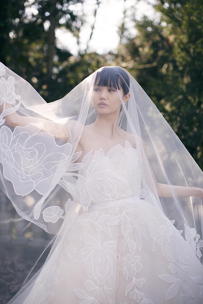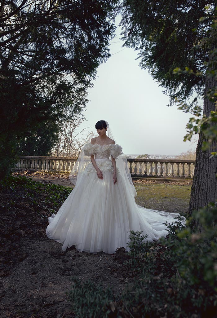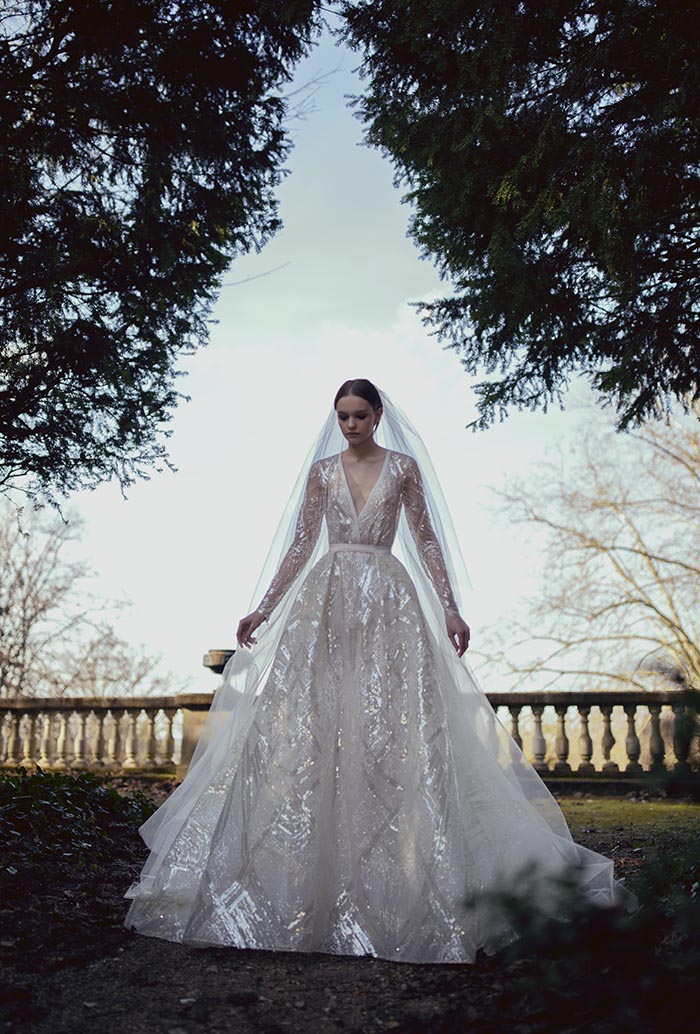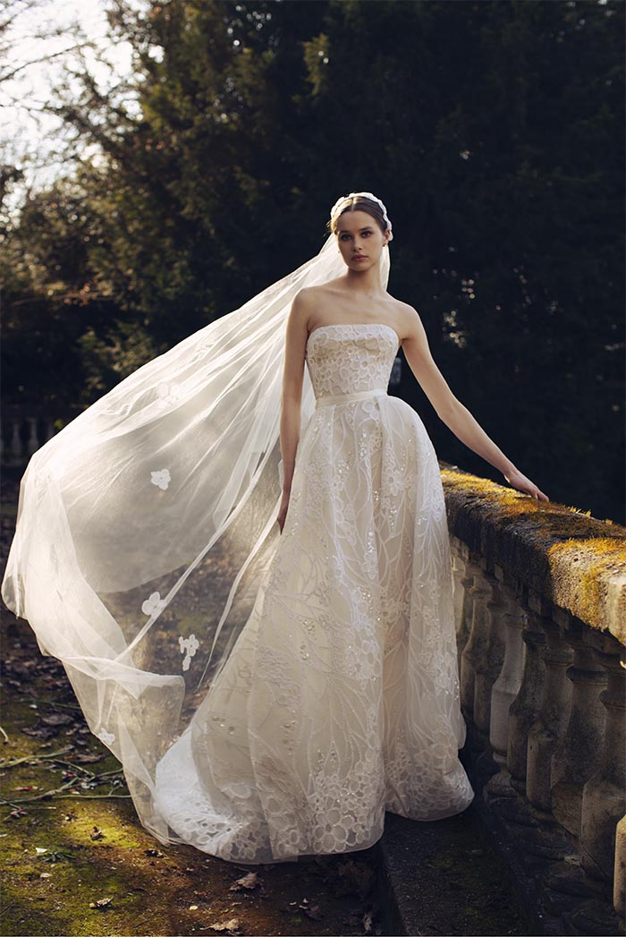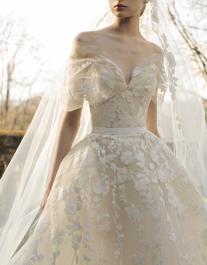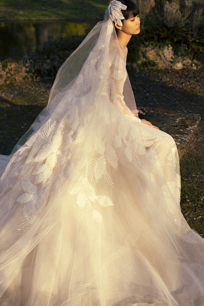 وفيرٌ في التفاصيل، ومعقّد في التكوين، ورشيق على القامة المتدفّقة، كلّ فستان راقٍ هو عمل فنّي فرديّ بحدّ ذاته. تتفتّح الأورغانزا الرقيقة ضمن باقة من الأزهار التي تتحرّك عبر خطوط العنق الفخمة، وعبر أربطة الكتف الرقيقة؛ وفي أسفل التول هناك أشكال مختلفة من أوراق الشجر. ينبعث لمعان رقيق من الفساتين المطرّزة بالترتر الشفّاف، ممّا يسمح للديكولتيه والظهر المفتوح بالاحتفال من خلال مهارة في التوهّج السّاحر.