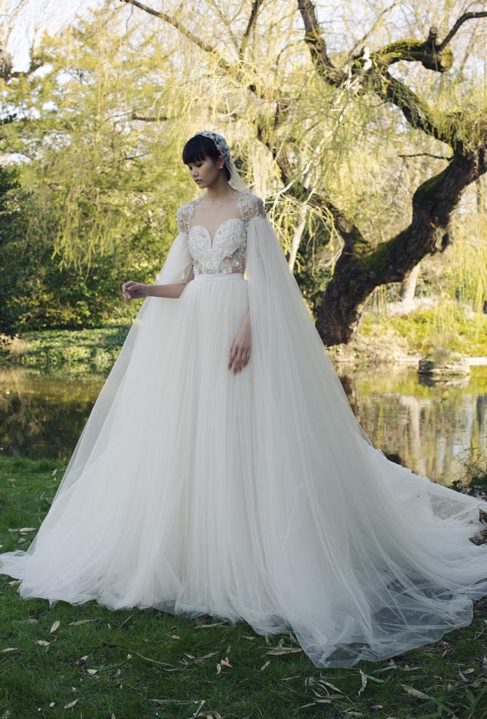 الأكمام كالشلاّل تنسدل إلى الأسفل مع اللآلئ الملكيّة والترتر، والتنانير الضبابيّة من التول لا نهاية لها. تمّ نسج الزخارف المتقنة من خيوط الحرير بدقّة على الكشاكش المتدفّقة، بينما احتضن الدانتيل شانتيلي والغيبور بحنانٍ الشكلَ الطبيعيَّ للفستان.