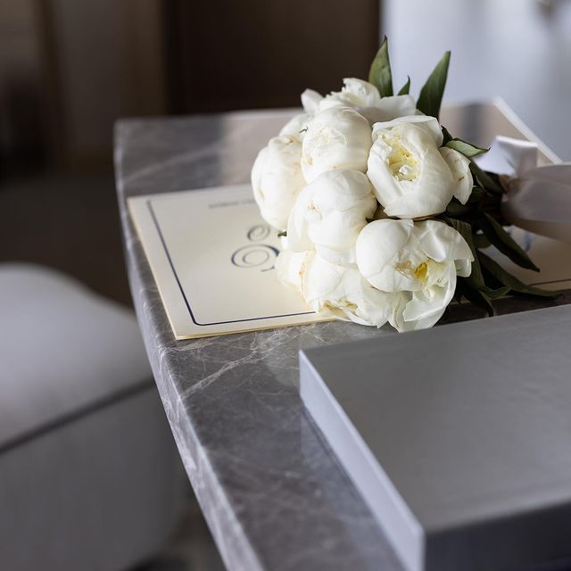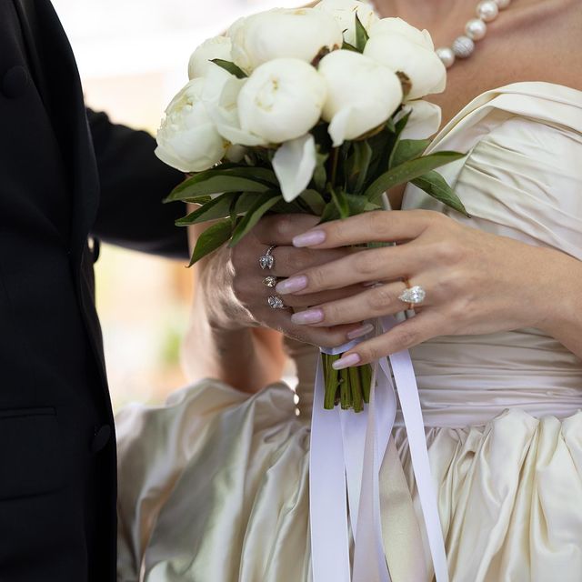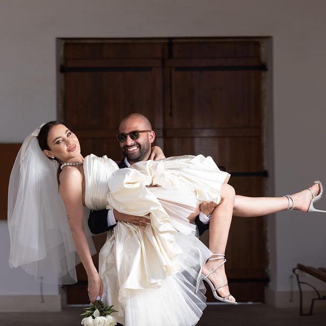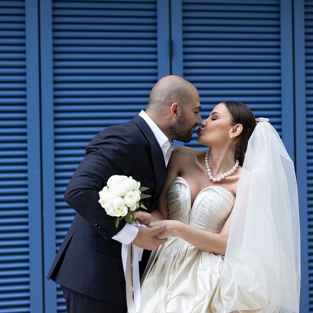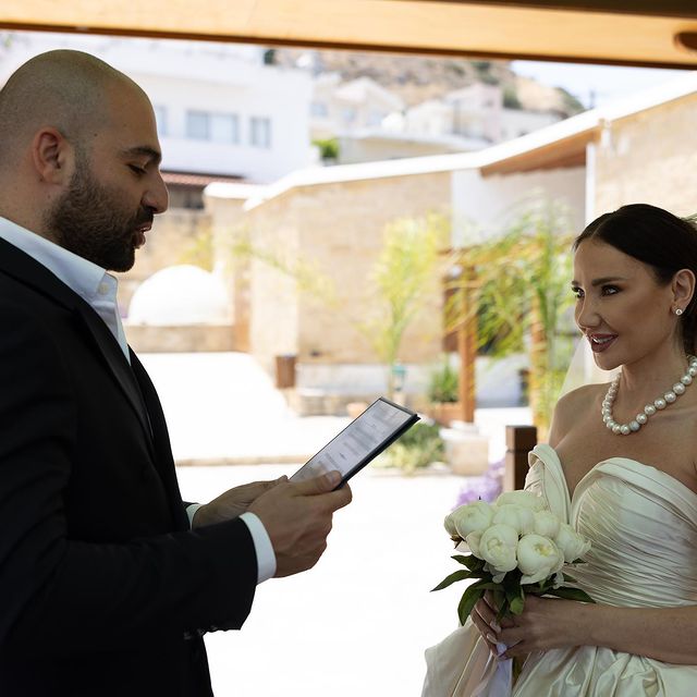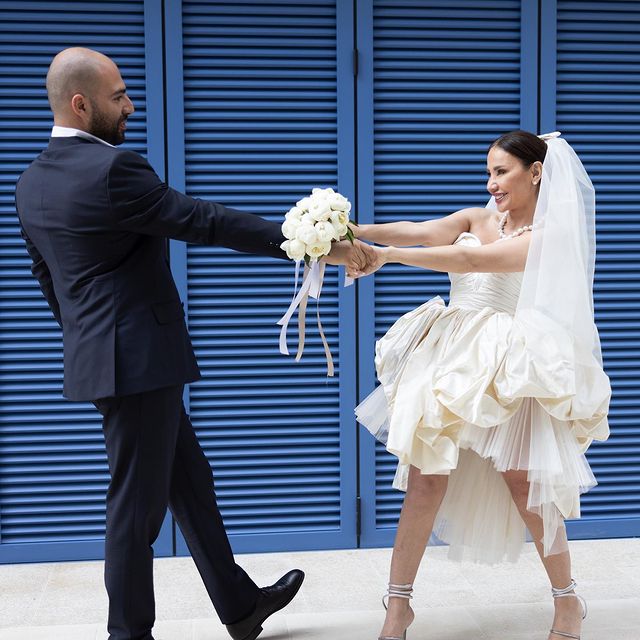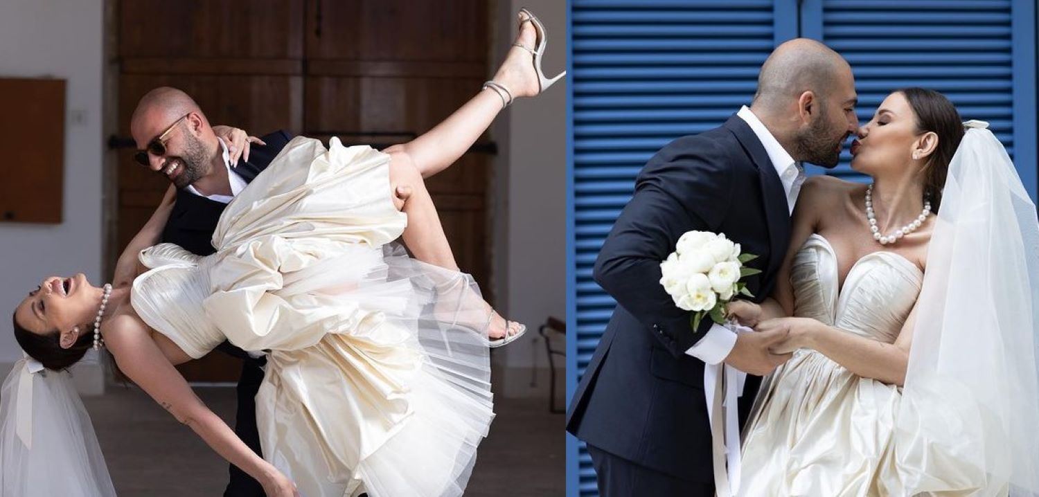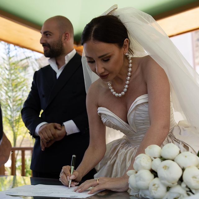في فيديو عبر الـ"إنستغرام" الخاصّ بها، يمكننا رؤية دخولها مع زوجها، بفستان مميّز لعقد الزواج المدنيّ في قبرص. لم يكن فستان عرسها عاديّاً، فقد اختارت الفاشيونيستا أن يكون قصيراً وغير متماثل في الجزء السفليّ، كما زيّنت كورساج السترابلس بالدرابيه، وعمدت إلى تزيين التنورة القصيرة التي ترتدي تحتها تنّورة "تحتانيّة" من التول الأبيض لمنحها حجماً منفوخاً، بالطيّات الرفيعة من الأمام والعريضة من الخلف، كما وضعت على الشينيون المسحوب الى الخلف طرحة قصيرة من التول. أنهت إطلالتها بعقد من اللؤلؤ على عنقها، وقرطين، بالإضافة الى الخواتم، وانتعلت مع الفستان والطرحة صندلاً بكعب مع أحزمة.