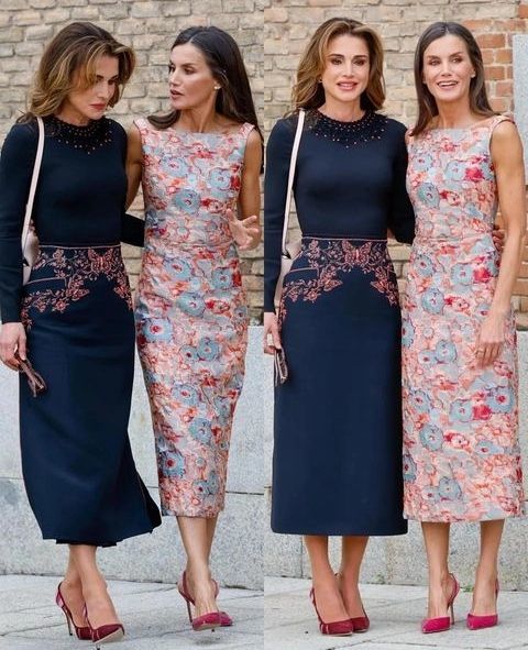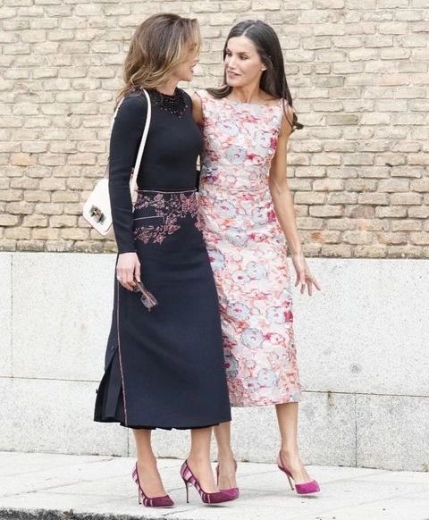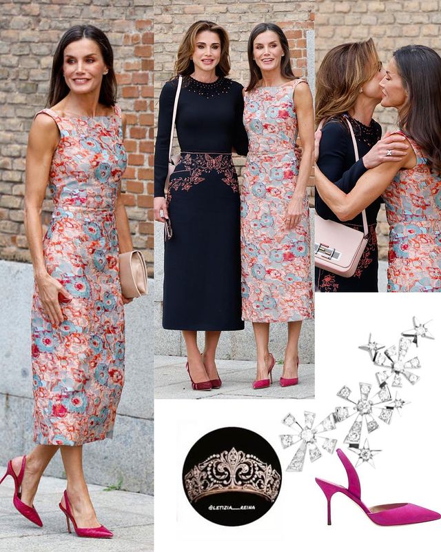أمّا ملكة إسبانيا ليتيزيا، فكانت مثالاً لأسلوب الصيف بفستان ميدي مطبّع بالأزهار من توقيع دار الكوتور الإسبانيّة Diego Estrada، التي جعلت الملكة في أناقة مثاليّة، مزيّنة بظلال دافئة من الأحمر والخوخي والأزرق الناعم، ثم أنهت مظهرها الملوّن بحذاء بكعب عالٍ وردي ساخن؛ وهو المفضل لديها، من توقيع Carolina Herrera. كذلك، أضافت الملكة لمسة من التألّق مع أقراط Gold & Roses مقابل 1،565 دولارًا. تألّقت ليتيزيا بمكياج خوخيّ ممتع يتناغم مع الطقس المشمس، وقامت باعتماد البراشينغ لشعرها البنّي الفاتح بأسلوب مستقيم.