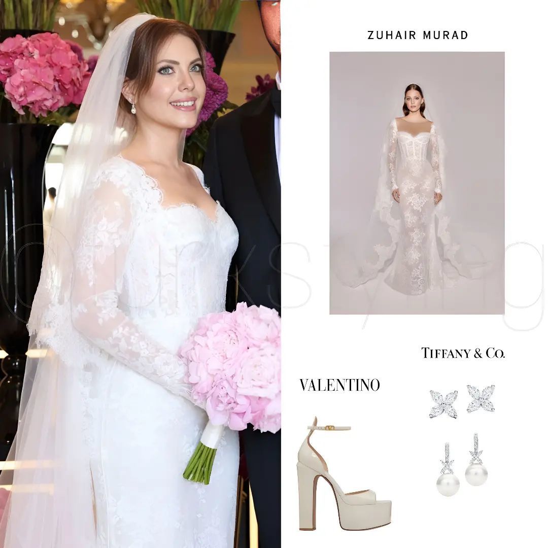 مع فستان العرس، انتعلت العروس الجميلة حذاءً أبيضَ عاليَ المنصّةِ من Valentino، وتزيّنت بمجوهرات Tiffany & Co