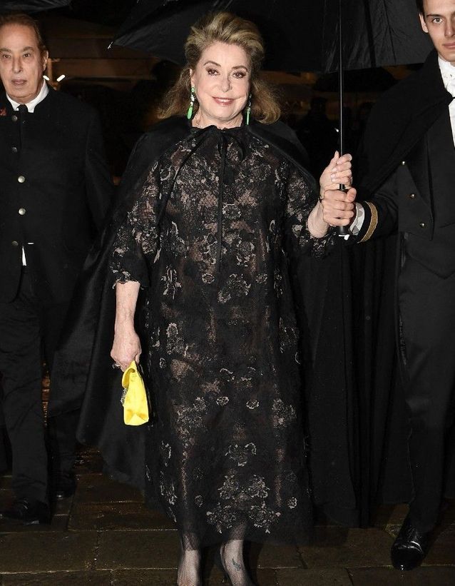 كسفيرة حقيقية للأناقة الفرنسية، قدّمت الممثلة البالغة من العمر 78 عامًا درسًا آخر في الأسلوب، من خلال فستان من الدانتيل الأسود مع مشلح من التول بتوقيع ديور. وجرياً على عادة أتباع أسلوب الروك السّاحر، توّجت كاثرين دونوف إطلالتها بحقيبة كلاتش صفراء.