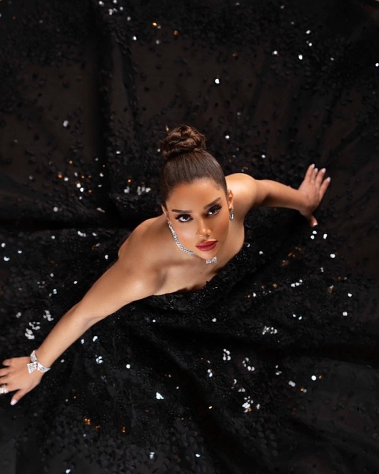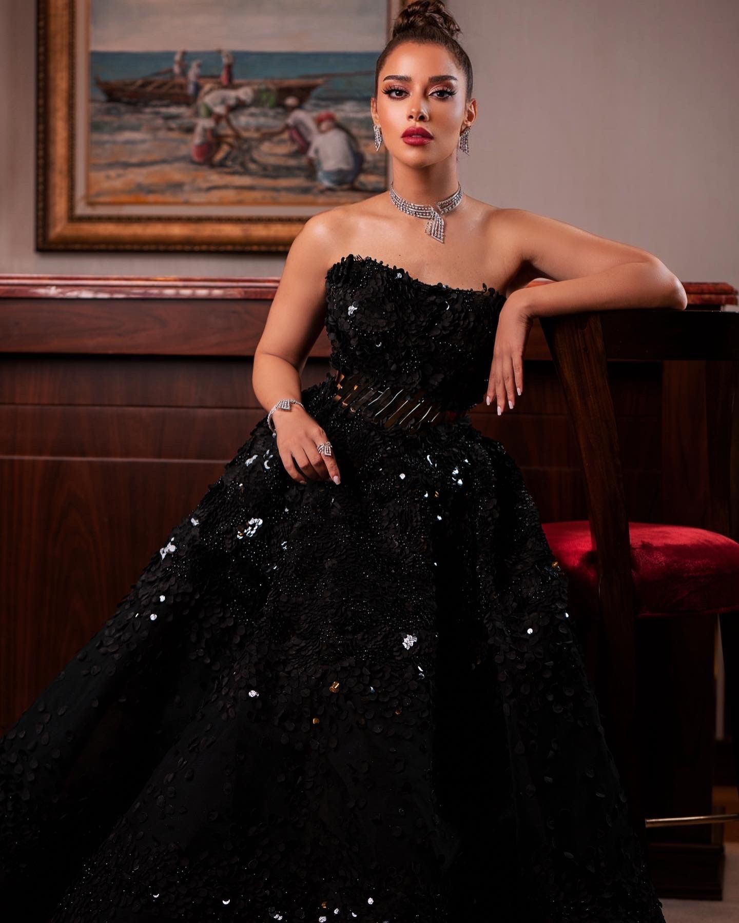 الفستان أسود طويل يصل حتى الكاحل هو من مجموعة ربيع وصيف 2022، منفّذ بقماش الساتان الرازمير، القصّات منفّذة باللايزر حتى الباييت والكريستال واللؤلؤ والبتلات المصنوعة من القماش مقصوصة كذلك باللايزر، حسب قول نجا سعادة للنهار، فكل بتلة وكل حبّة باييت ولؤلؤ، تمّ تقطيبها في ما بعد واحدة تلو الأخرى، لذا إحتاج الفستان الى الكثير من العمل لتنفيذه وإنهائه، تمّ تطريزه على النول بتقنيّة الهوت كوتور أي بالأيادي الصغيرة (فريق كبير قام بالعمل اليدوي) حتى أنّه تمّ قص الرازمير باللايزر بأحجام مختلفة ممّا استوجب ساعات من العمل كما تمّ الشغل أيضاً على الحزام المعدني الذي زيّن الخصر.