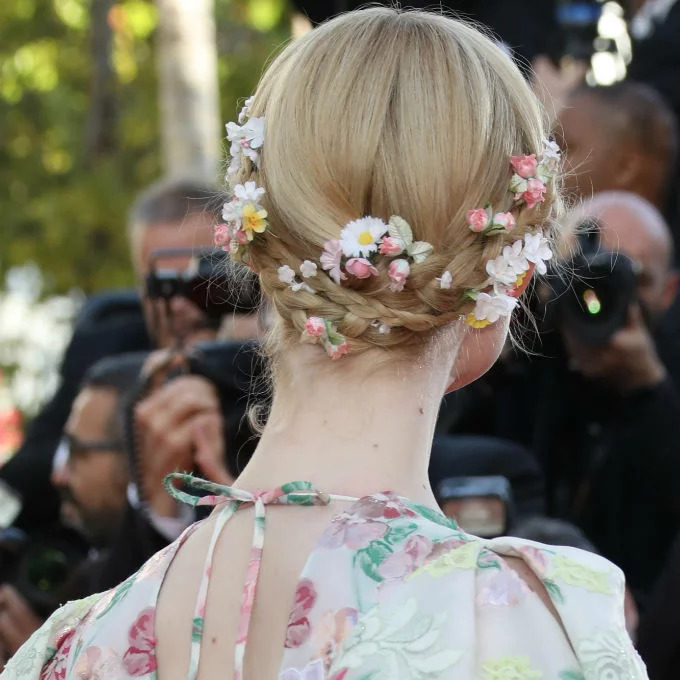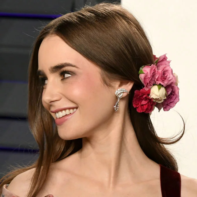 يمكنك أيضًا اللعب على اللمسة الرومانسيّة عن طريق وضع الزهور في شعرك المتموّج أو في الشينيون تمامًا مثل Lily Collins أو Elle Fanning.