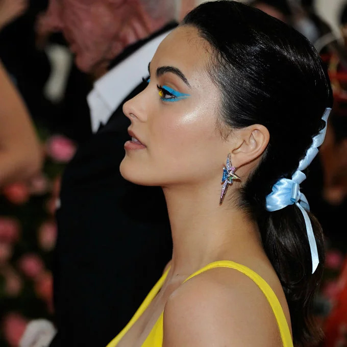 شريط من الحرير الأزرق يزيّن ضفيرة Camila Mendes