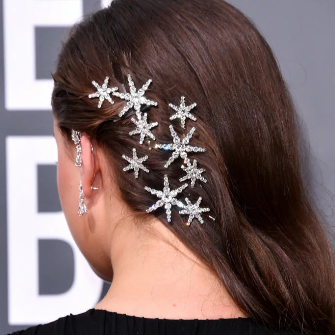 يمكنك أيضًا المراهنة على الفضّة بمشابك النجوم التي توضع على الضفائر أو الشينيون المبعثر للحصول على تأثير مصفّف وأشعث في نفس الوقت.