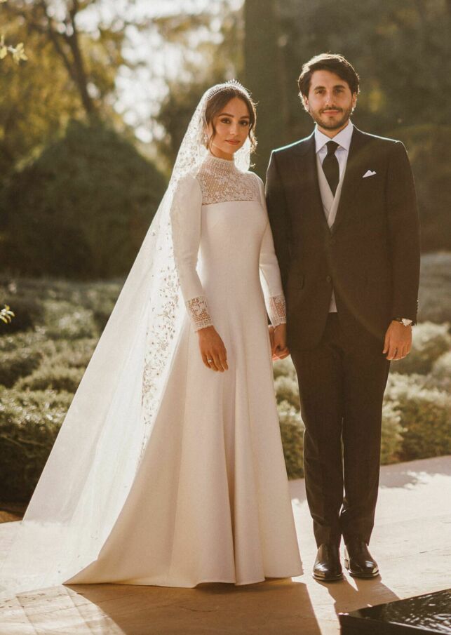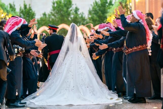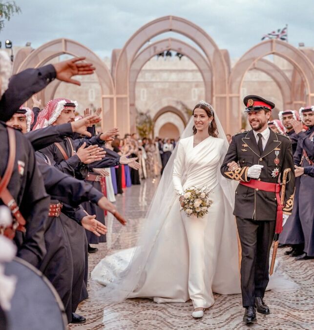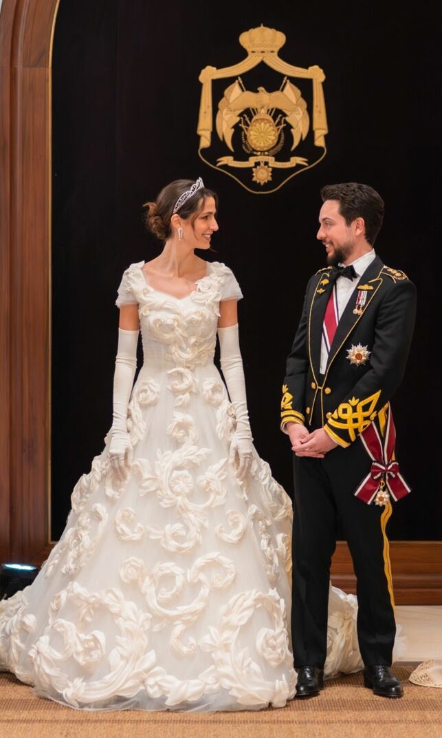 في 1 حزيران، تزوّج ولي العهد الأمير الحسين خطيبته رجوة السيف في حدائق قصر زهران في عمّان. اختارت الأميرة وملكة الأردن المستقبلية فستانَين بأسلوب مختلف. التصميم الأوّل الرائع، طويل ومصقول، مع خطّ رقبة غير متماثل وقصّة مستقيمة، مصنوع من الحرير الكريب ومطرز بـ550 بتلة، بتوقيع إيلي صعب.