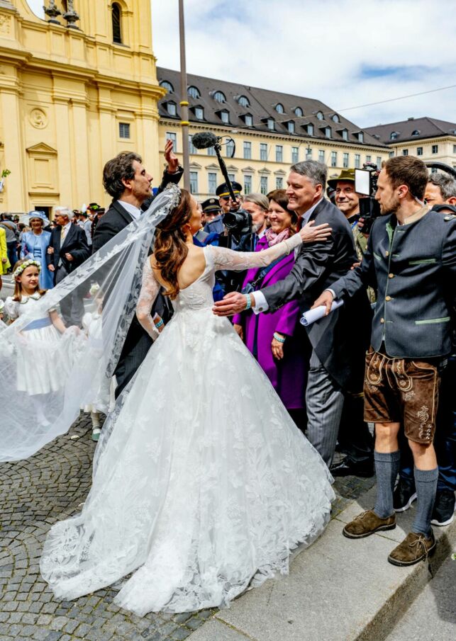 حفل زفاف لويس أمير دو بافاريا وصوفي ألكسندرا إيفكينك في كنيسة سانت كاجيتان في ميونيخ، ألمانيا، في 20 أيّار 2023. ترتدي فستانًا من ماركة Reem Acra وطرحة طويلة من العلامة التجارية الأوكرانية Wona-Concept.