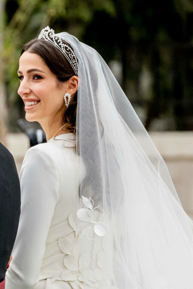 في حفل زفافها، زيّنت الأميرة رجوة الحسين إطلالتها بتاج مزيّن بالألماس صنع لها شخصيّاً من قبل Yan Sicard de Fred Jewelry.