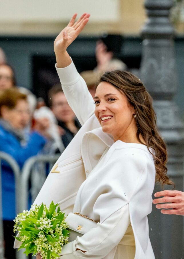 حفل الزفاف المدني للأميرة ألكسندرا، أميرة لوكسمبورغ، ونيكولاس باجوري، 22 نيسان 2023. ترتدي كاب رائع من ماركة فالنتينو بسعر يزيد عن 2000 يورو، بالإضافة إلى حقيبة شانيل.