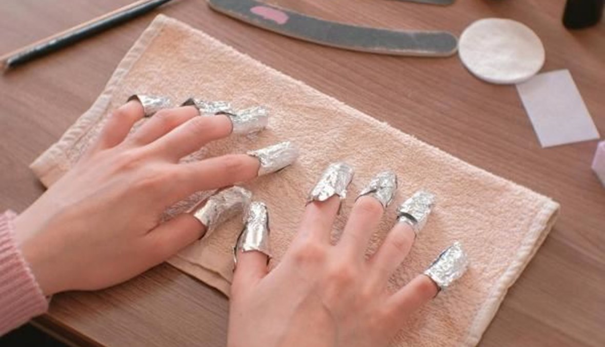 إذا كنت تريدين أن تكون العملية أسرع قليلاً وأكثر دقة، فإن إحدى الطرق التي يمكنك استخدامها هي رقائق الألومنيوم. لهذا، نتبع نفس عملية برد وإزالة طلاء الأظافر. يمكنك أيضًا قص طول الظفر الاصطناعي لرسم خط حول إزالته.