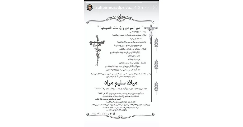 وزهير مراد من بلدة رأس بعلبك، وهناك ستتم الصلاة لراحة نفس والده، في كنيسة رأس بعلبك العجائبيّة، حيث ستُقبل التعازي قبل الدّفن وبعده. وحدّد يوم الأربعاء المُصادَف لـ21 من الشهر الجاري موعدًا لتقبّل التّعازي في بيروت، في صالون مطرانيّة الروم الملكيّين الكاثوليك، الواقعة على طريق الشّام، قرب المتحف الوطني.