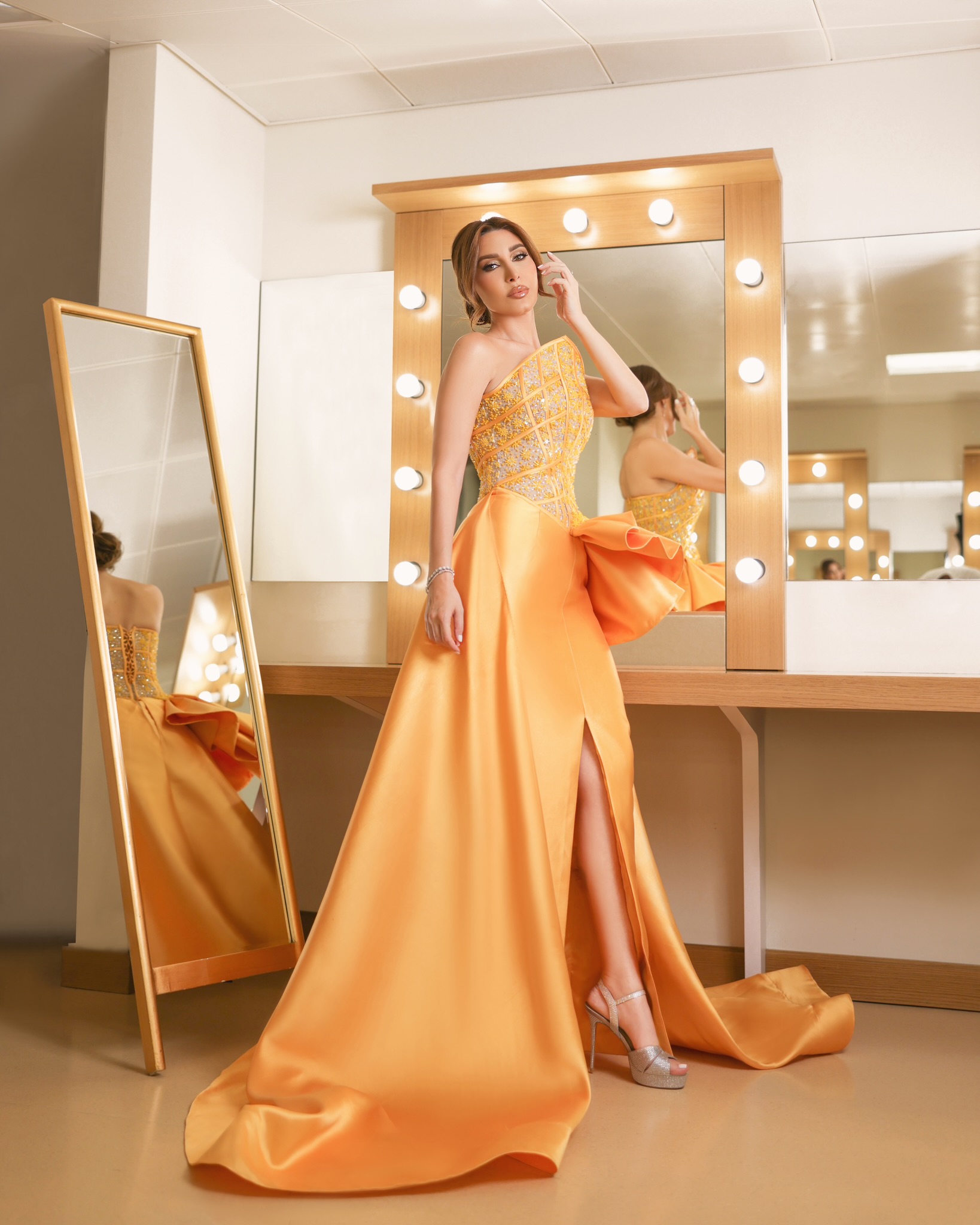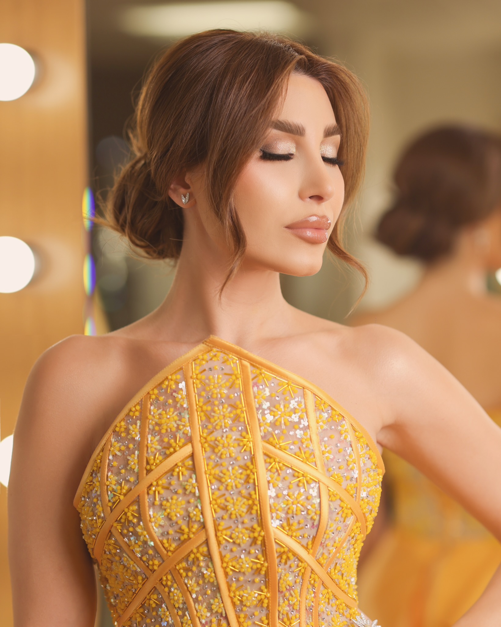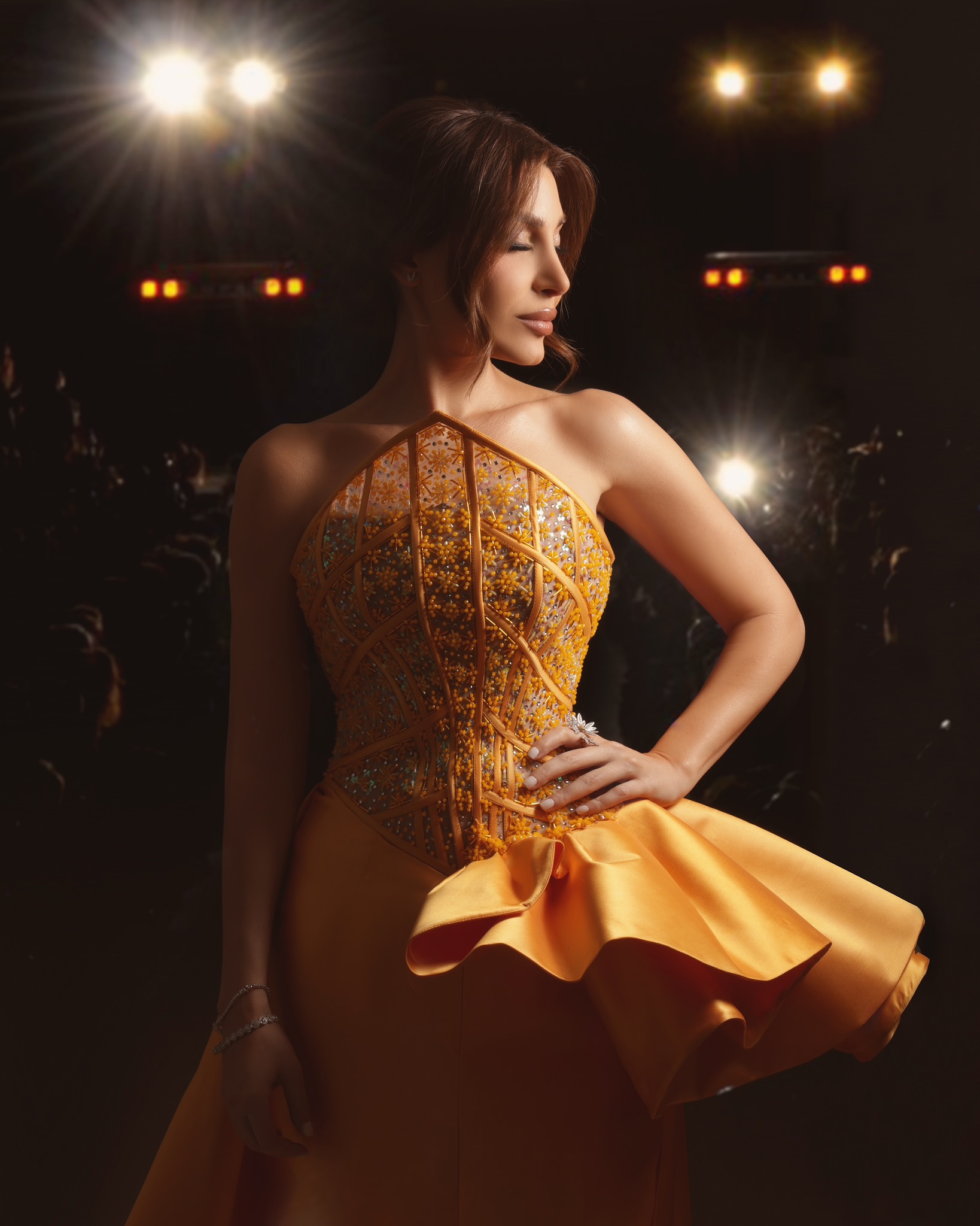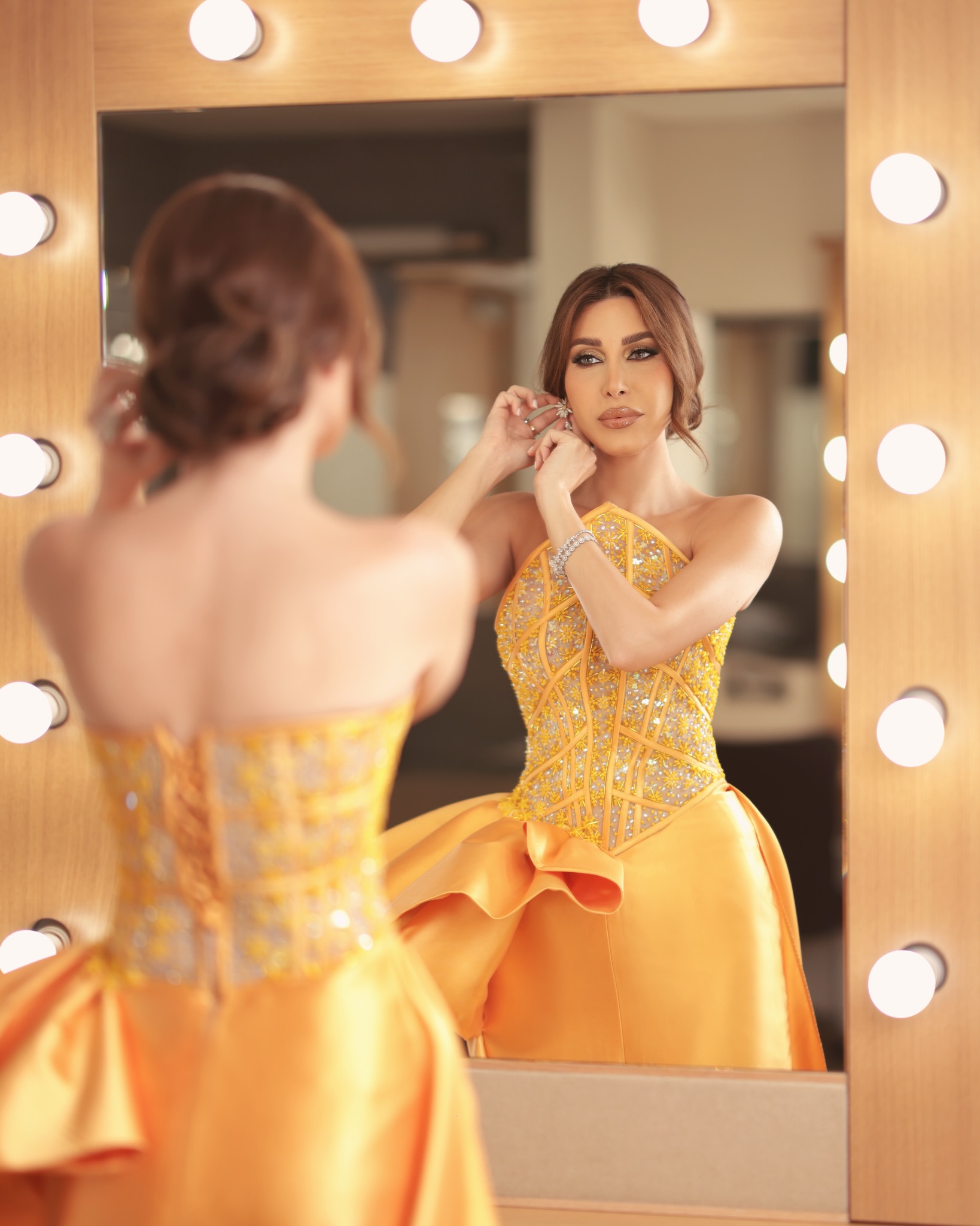 الفستان باللون الأصفر، سترابلس، أهم ما يميّزه الكورسيه المنفّذ يدوياً بشكل دقيق جداً مستوحى من طابع خيالي أوريجينال، هذا النوع من الكورسيه لم يكن مرئيّاً سابقاً في صناعة الموضة، يجمع بين الطابع المستقبلي والأنثوي مصنوع من قماش الكورسيه المعروف، مطرّز بالخرز والأحجار والباييت، ويقول لنا المبدع شربل زوي: "أردت أن أدمج اللون الأصفر الفاهي مع الآخر الغامق، وأمدّد قسماً من الكورسيه نحو البطن ليلتصق بالتنورة الطويلة المنفّذة بقماش الميكادو، والتي تمتدّ على شكل ذيل مع نصف فراك على الخصر يمتد من الأمام الى الخلف ... هذا الفستان يجسّد روح مجموعة كوتور ربيع وصيف 2024 التي سوف أعرضها قريباً، وأنا عدّلت نوعاً ما في الفستان لكي يتناغم مع شخصيّة يارا، أردت أن أمنحها ستايل جديد وأوريجينال، لاسيّما وأنّ هذا الطابع باللون الأصفر لم ترتديه سابقاً. لقد كان التعامل معها رائعاً، شعرت وكأنّني أعرفها منذ زمن."