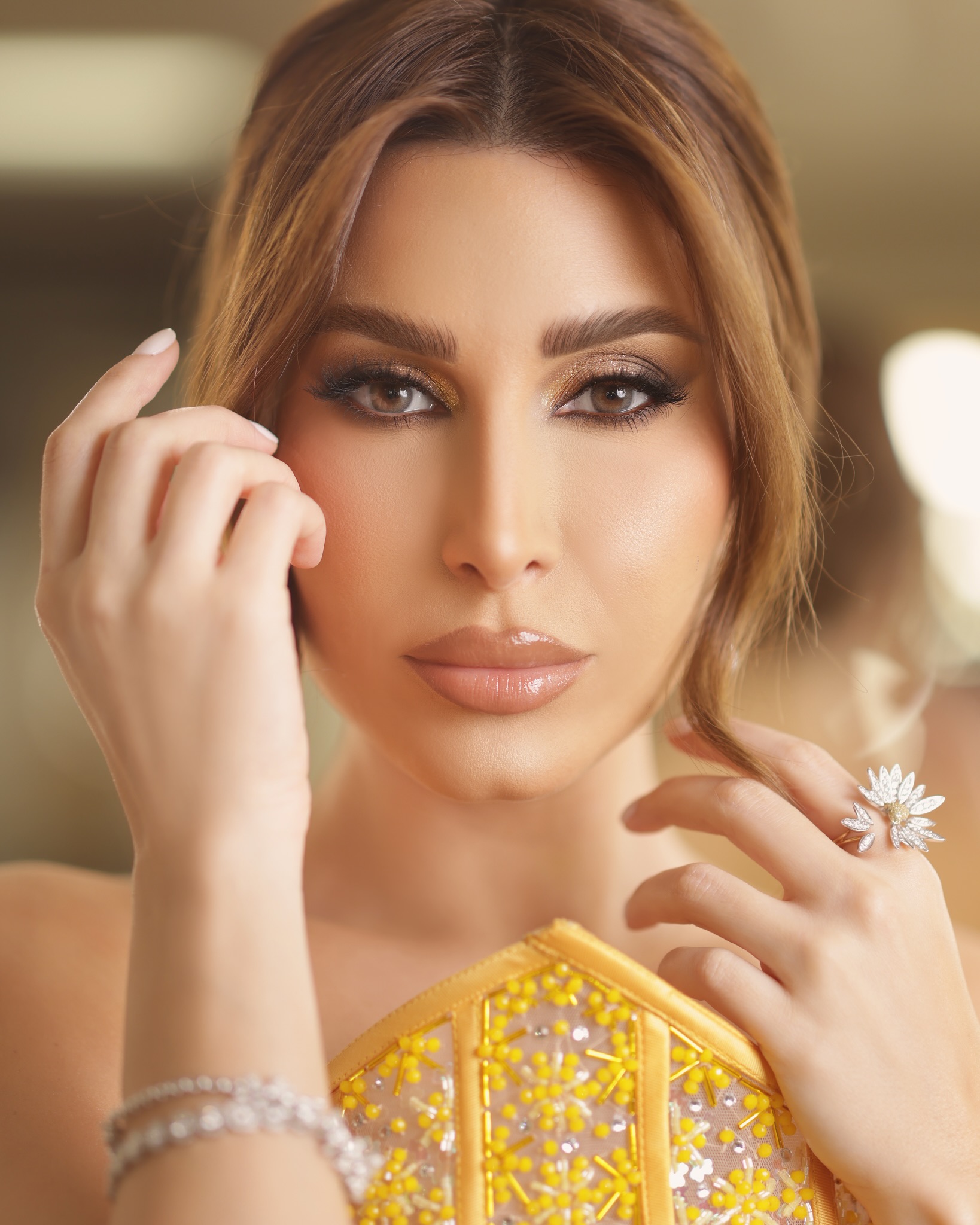 تزيّنت المغنية بمجوهرات Samra Jewellery، وتمّ التركيز في مكياجها على العينين اللتين رسمتا بالآي لاينر مع الرموش المستعارة، كما اعتمد لون النيود للشّفتين، التسريحة أيضاً كانت رائعة. إطلالة لا تشوبها أيّ شائبة!