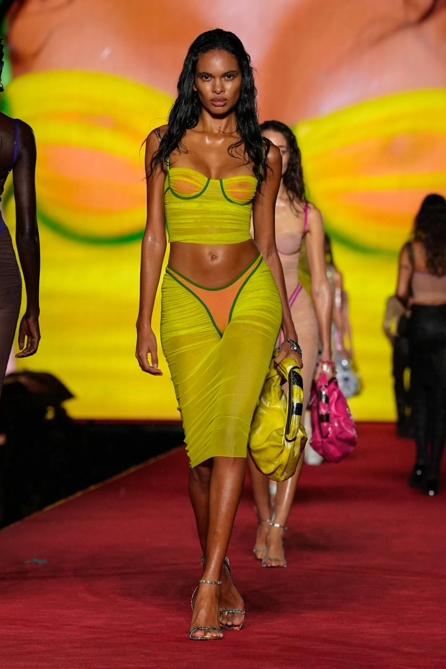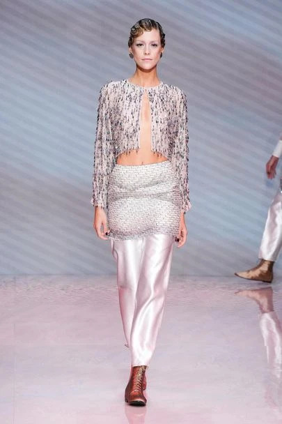 تماشيًا مع اتجاه احتضان الجسم الذي جعل الكورسيهات والروب توب بنمط حمّالات الصدر والسراويل القصيرة جزءًا لا يتجزأ من خزانة الملابس اليوميّة، تمّ عرض بعض الإطلالات  في الهواء الطلق تمامًا، مع جوارب شفافة مربوطة بأحزمة.