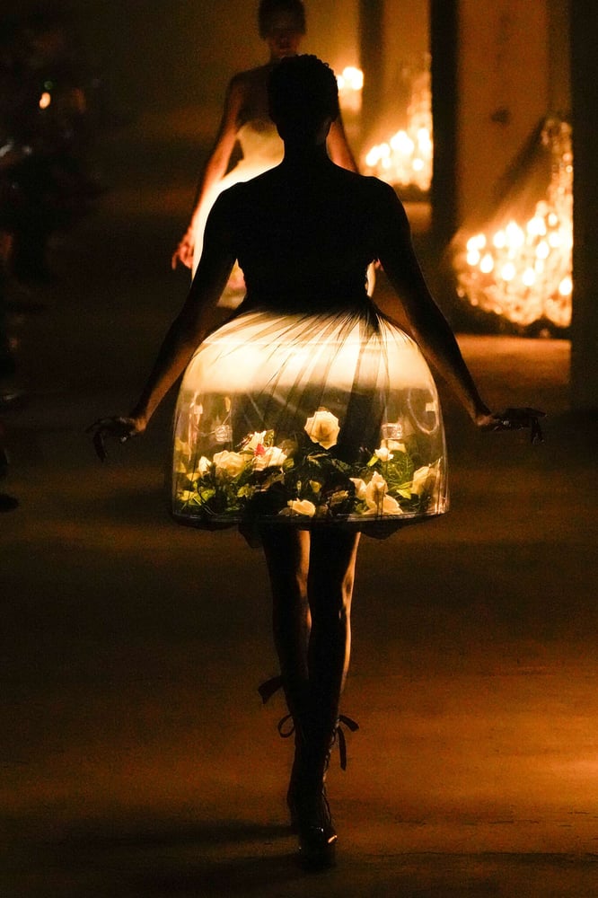 تمّ تسليط الضوء على الوردة، رمز الحب والعاطفة، في عدّة مجموعات. على وجه الخصوص، لدى Balmain، مما يجعلها الموضوع الرئيسي لخزانة ملابس المرأة لصيف 2024. تماما مثل David Koma. ونجدها أيضاً مطبوعة بشكل عملاق على فستان سهرة لدى ألكسندر ماكوين، ومركّبة أيضاً على الملابس، هنا وهناك. باقات من الورود محاصرة تحت التول لدى Simone Rocha أو Undercover في فساتين مذهلة شبيهة بحوض السمك.
