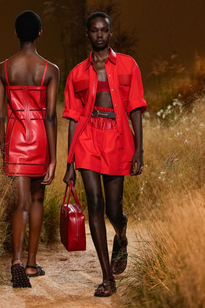لقد حقّق هذا اللون القوّي والنابض بالحياة بالفعل نجاحات ملحوظة في المجموعات في المواسم الأخيرة، ولكن بالنسبة لربيع وصيف 2024، فإنه يفرض نفسه في ومضات مبهرجة، فاللون الأحمر ساهم في تنشيط مروحة الألوان المحايدة أو الكلاسيكية أو الباستيل أو الأسود والأبيض، التي ميّزت معظم المجموعات. إنّ المظهر الأحمر الكلّي أو القطعة المهمّة من اللون القرمزي أو العقيق أو الأحمر الناري أمر لا بدّ منه في خزانة الملابس الصيفيّة. كرّست Hermès مجموعتها بالكامل تقريبًا له.
