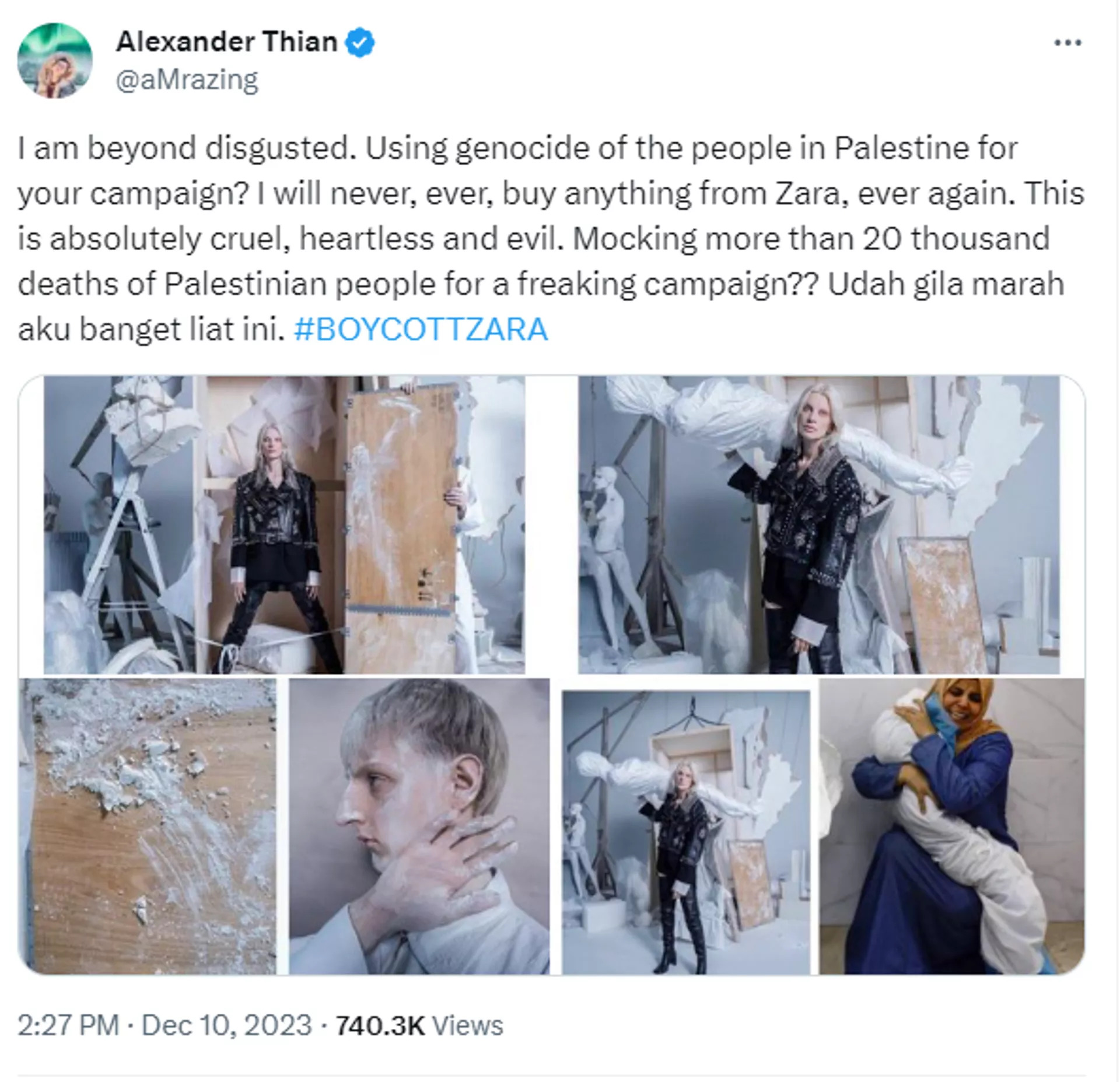 بعد نشر حملة إعلانيّة لماركة Zara الإسبانيّة بعد تصوير العارضات وهنّ يحملنَ منحوتات شبهها الناس بصور الحرب بين إسرائيل وحماس وأثارت غضباً واسعاً، أصدرت سلسلة الملابس Zara الماركة الإسبانيّة المعروفة بيانًا برّرت فيه لقطات الصور هذه قائلة: "بعد الاستماع إلى التعليقات المتعلّقة بحملة Zara Atelier الأخيرة "السترة"، نود مشاركة ما يلي مع عملائنا: "تضمّ الحملة، التي صوّرت في شهر أيلول، سلسلة من المنحوتات غير المكتملة في استوديو النحّاتين، وأنشئت لغرض وحيد هو عرض الملابس المصنوعة يدويًّا في سياق فنّي".