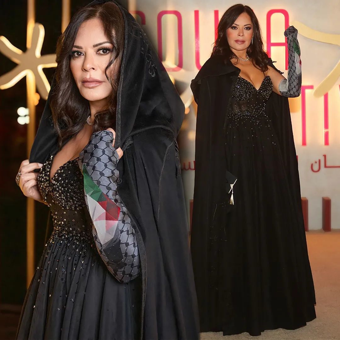 تضامناً مع ما يجري في غزّة، كانت الكوفيّة الفلسطينيّة حاضرة في إطلالة كارمن لبّس في مهرجان الجونة بدورته السادسة، فقد حضرت النجمة اللبنانيّة بفستان أسود مع كاب بقلنسوة، إطلالة قوطيّة معصرنة مستوحاة من القرون الوسطى من توقيع المصمّم اللبناني إيلي بجاني، تقسّم الإطلالة الى قسمين، فستان بكورسيه مطرّز من الساتان مدمج بتنّورة مع ثنيات، وقفّاز أوبرا لفت الأنظار برسمته التي تضمّنت علم فلسطين. يغطّي الفستان كاب طويل قوطيّ النمط. زيّنت النجمة إطلالتها بعقد من الفضّة وخواتم وقرطين من تصميم رندة طبّاع.