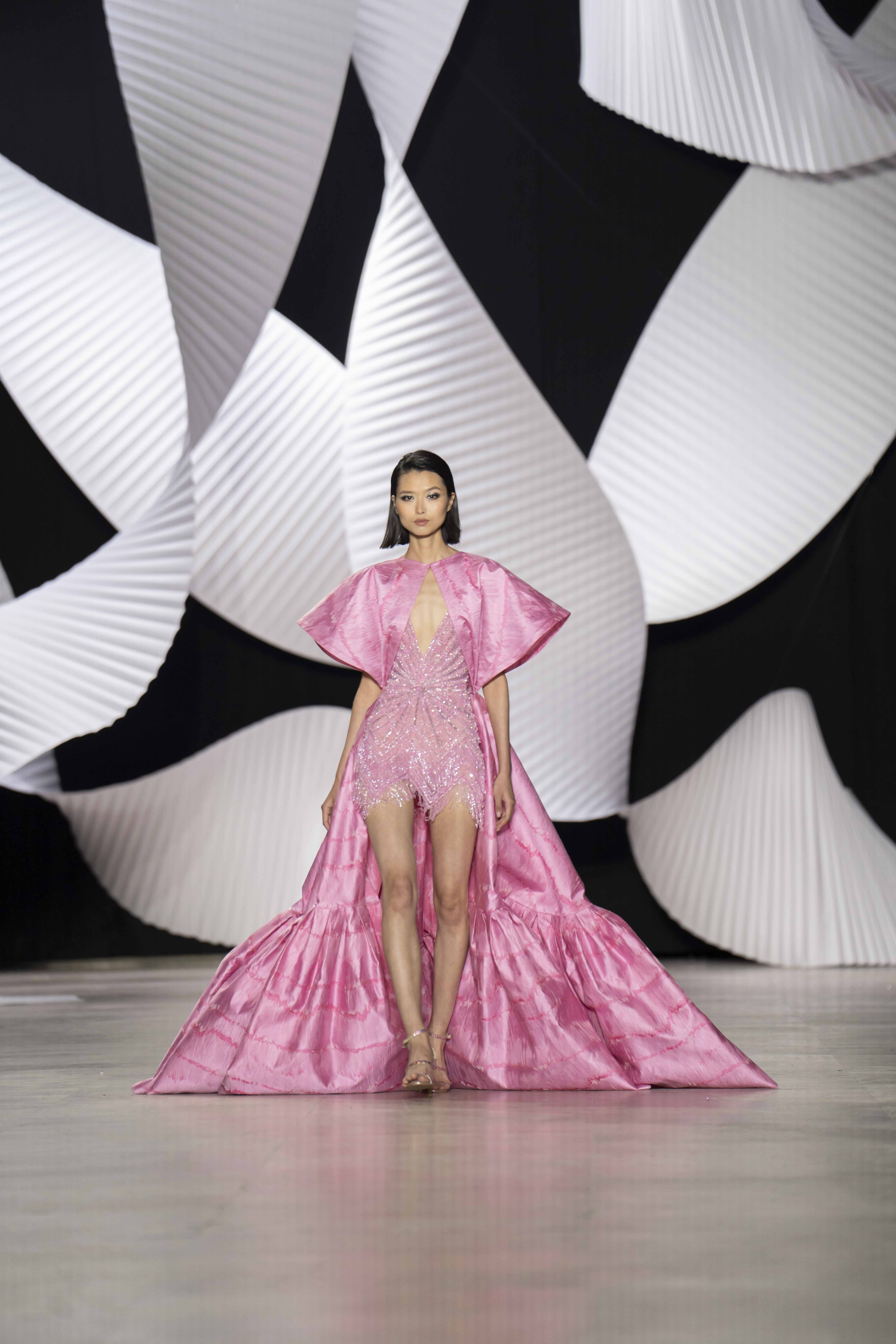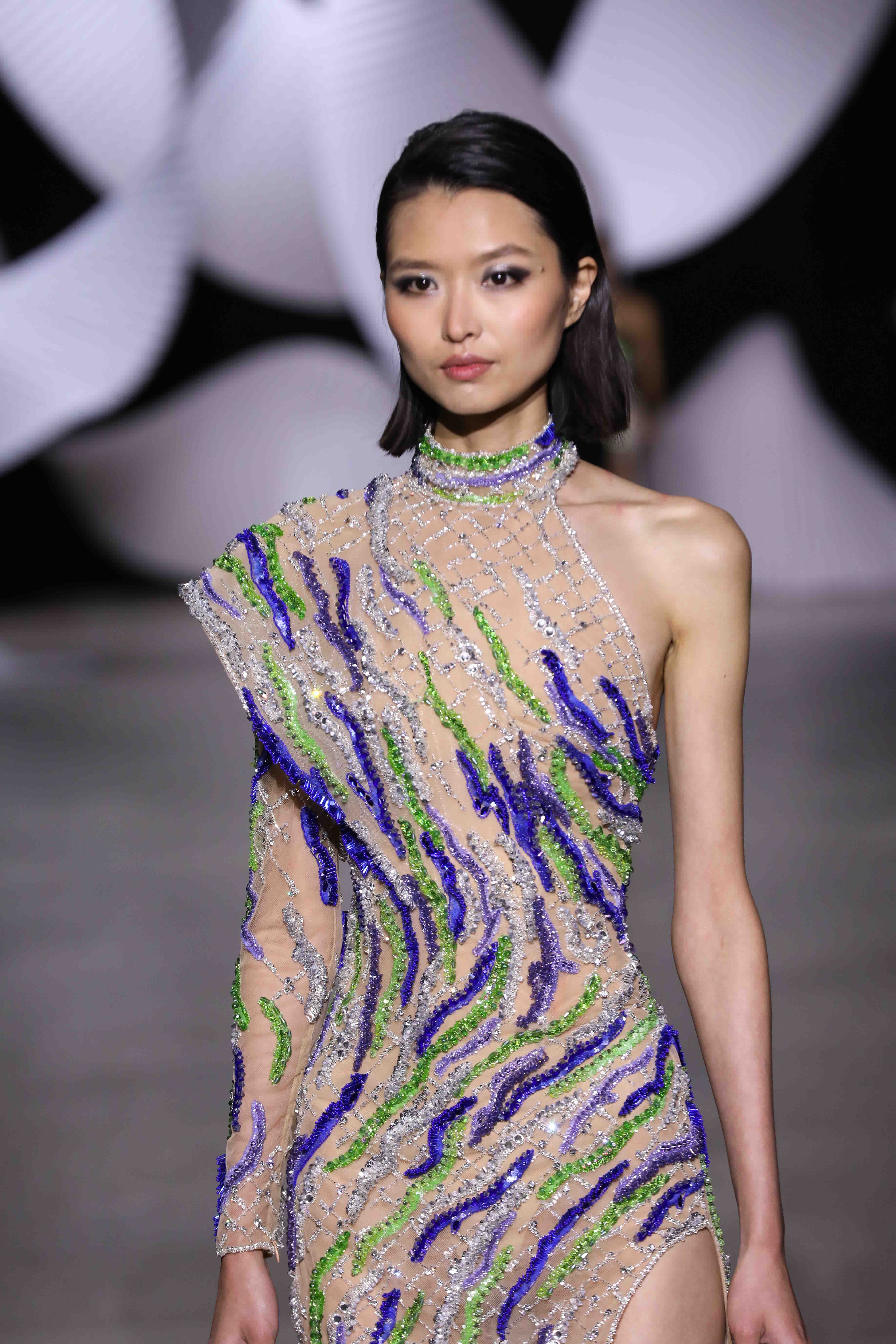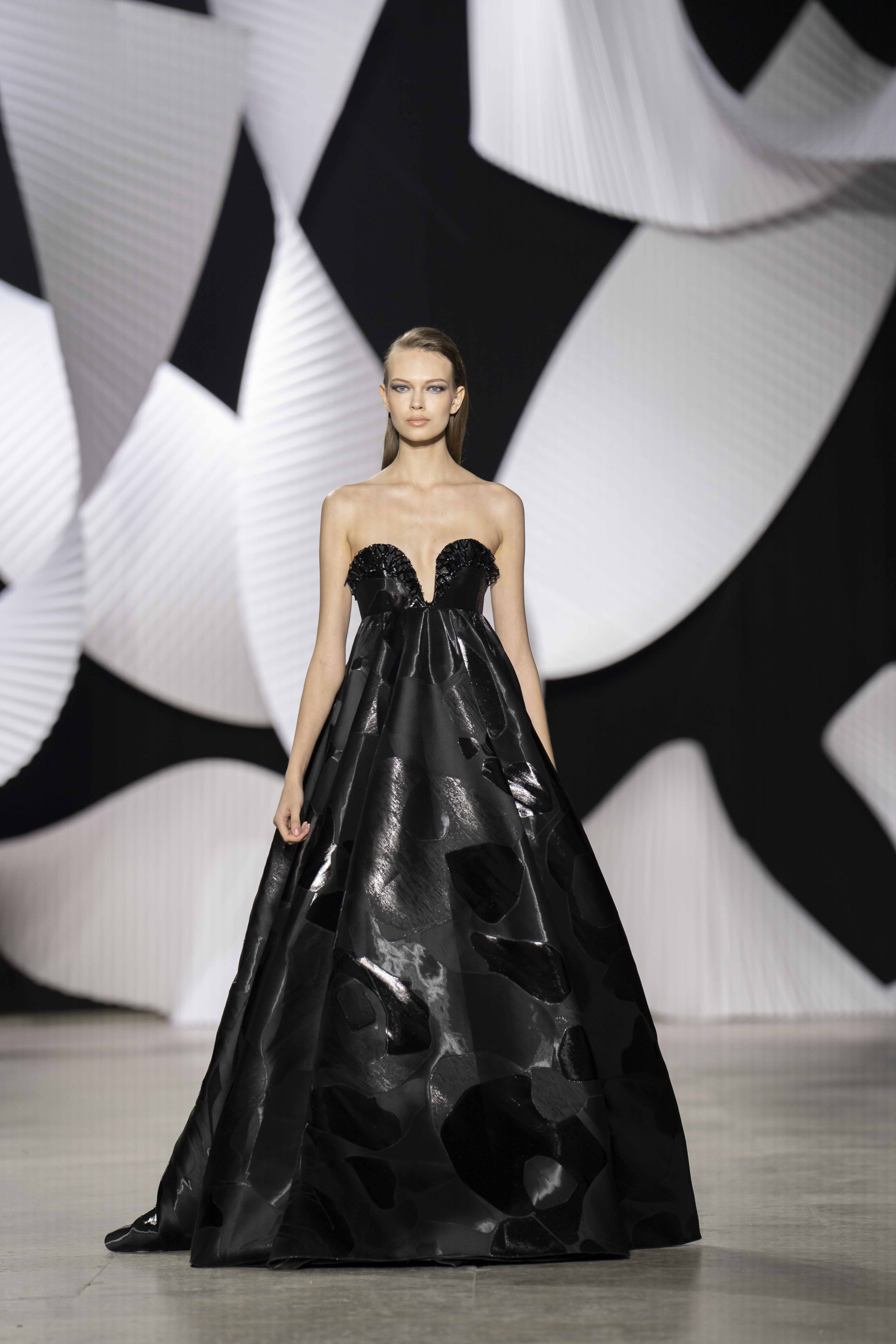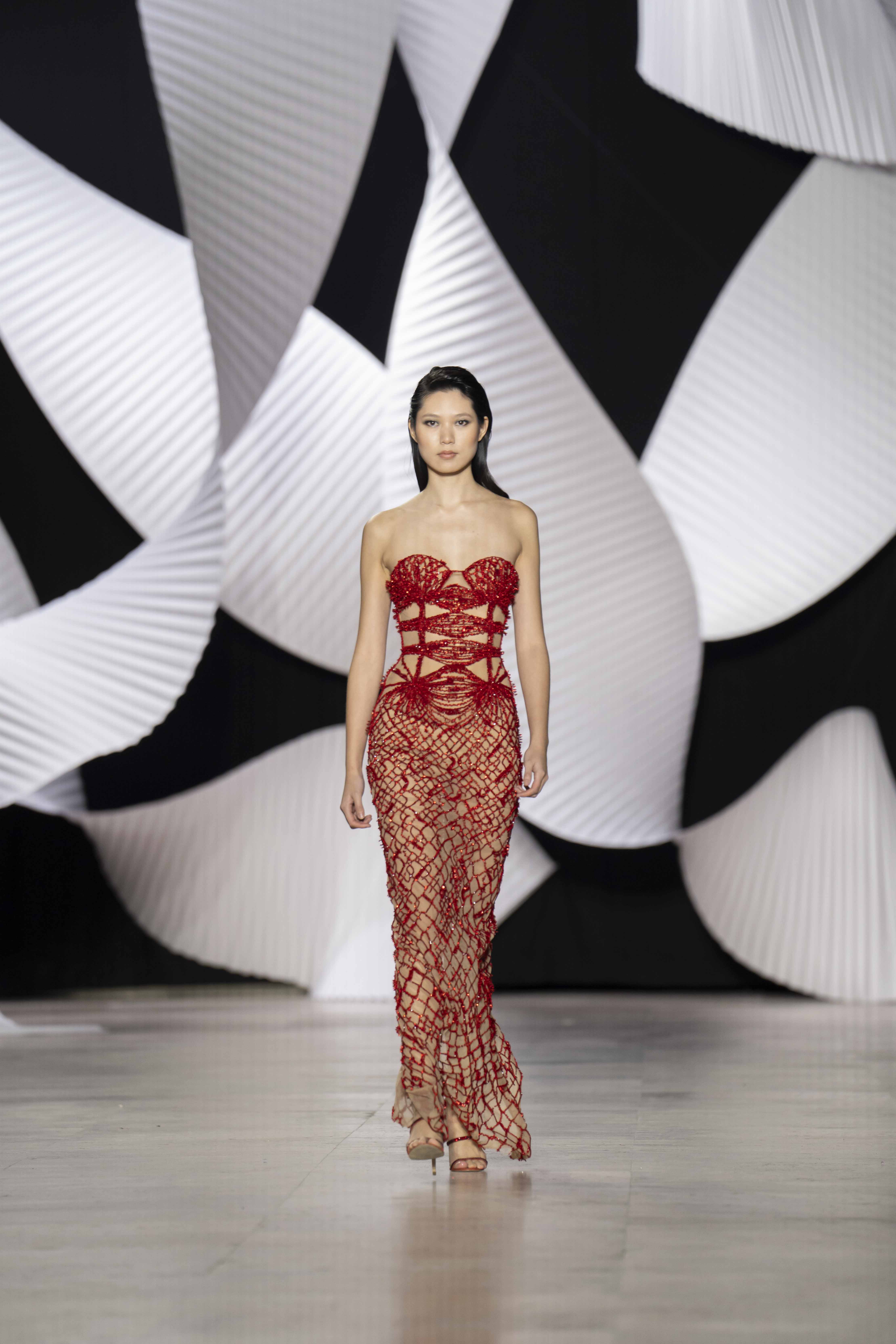 في قصر طوكيو Palais de Tokyo في باريس، كشفت المجموعة عن قامات شاعرية رائعة ممزوجة بتقنيّة عصريّة... ثمة خبرة مبتكرة ثلاثيّة الأبعاد تجمع بين أعمال النسيج المثيرة للاهتمام والفساتين المناسبة للصورة الظليّة، إلى جانب الأحجام الدراميّة، واللآلئ المتراقصة، التي تتحرك بفضل الأضواء الكاشفة، والمشالح المسرحية، والفتحات الشفّافة الرقيقة ولكن الجريئة، والشقوق العالية لتي تصل حتى الفخذ، والكورسيهات الجذابة التي تعانق الخصر، والمواد السائلة التي تغزو المنصّة، والجوانب غير المتماثلة التي تتناقض مع القطعة نفسها وتعانقها برقّة.