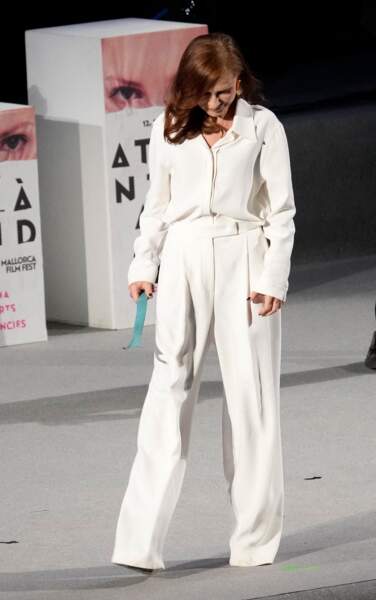 أمّا إيزابيل هوبير فكان زيّها مناقضاً تماماً من حيث الأسلوب واللون، إذ ارتدت قميص وسروال palazzo أبيض واسعاً وإنسيابياً ومجوهرات ذهبية، الإطلالة تذكرنا بثلاثينيات القرن الماضي وبأسلوب مارلين دييتريش. ومع شعر أحمر مموّج قليلاً وفضفاض، ونظارات شمسية سوداء كبيرة، تألّقت الممثلة الفرنسية أيضًا في مظهر صيفي للغاية.