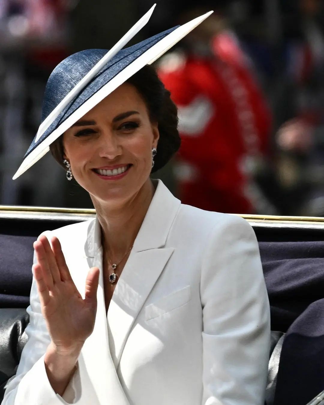 بمناسبة يوبيل الملكة وحضور موكب Trooping the colour، قامت كيت ميدلتون بإعادة تدوير معطفها الأبيض الطويل والجميل للغاية والذي ابتاعته بسعر 3000 يورو، مع قبعة فيليب تريسي باللونين الأزرق والأبيض وتزيّنت بمجوهرات الأميرة ديانا من الياقوت الموقعة من كارتييه. إطلالة خلاّبة!