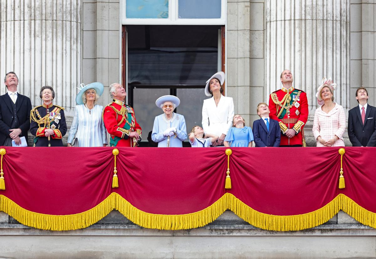 ظهرت الملكة إليزابيث الثانية على شرفة قصر باكنغهام، برفقة دوق كينت إدوارد، لتحية قوّات Trooping the Colour، قبل أن تنضم إليها العائلة المالكة.