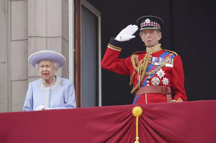 الملكة إليزابيث الثانية مع دوق كينت على شرفة قصر باكنغهام في لندن، في اليوم الأوّل من اليوبيل البلاتيني