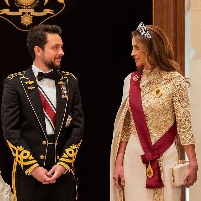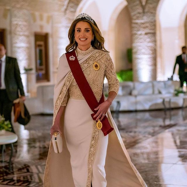 في حفل الاستقبال الذي جرى بعد الزفاف، وبعد إطلالتها الأولى بفستان ديور الأسود، بدت الملكة رانيا أكثر إشراقاً بإطلالتها الثانية، إذ ارتدت فستاناً رائعاً جداً باللون البيج من تصميم إيلي صعب، مطرّزاً باللؤلؤ في الأعلى ومدمجاً بمشلح تمّ تركيزه على كتف واحد مع ياقة عالية. تناغم الفستان مع لون بشرتها وقامتها وقبل كل شيء مع مكانتها كملكة الأردن. ولإكمال الإطلالة وضعت الملكة تاجاً على رأسها مع إبقاء الشعر منسدلاً. الثوب من مجموعة إيلي صعب كوتور ربيع وصيف 2023. الملكة بدت سعيدة وفرحة وفخورة بابنها، وكانت تستقبل الضيوف بابتسامة مشعّة.