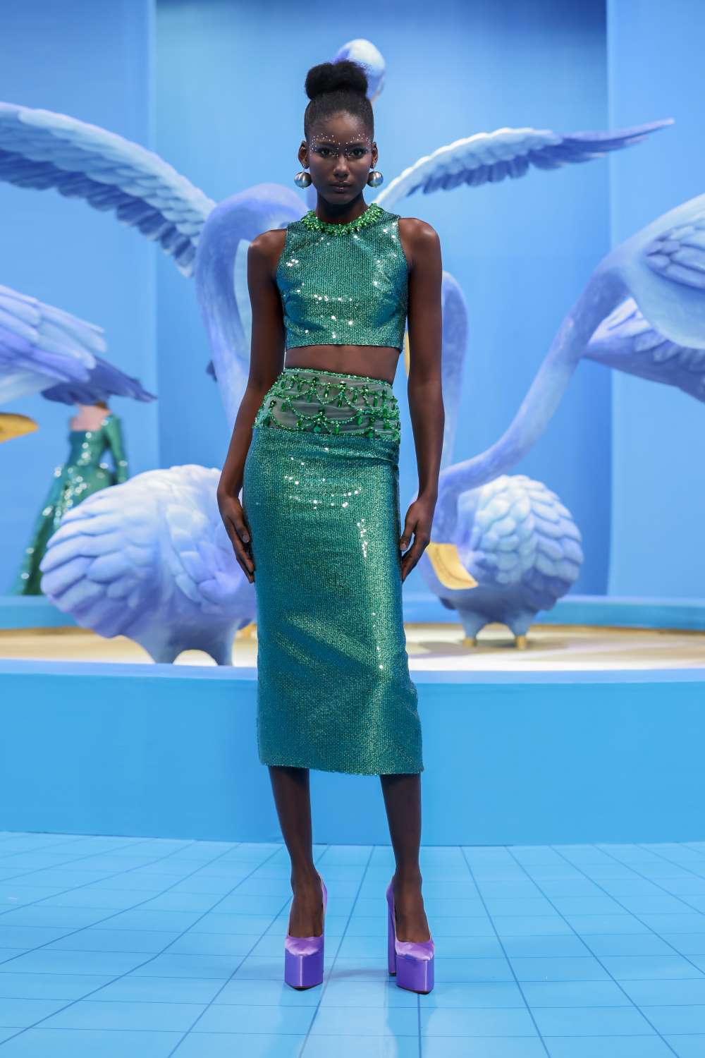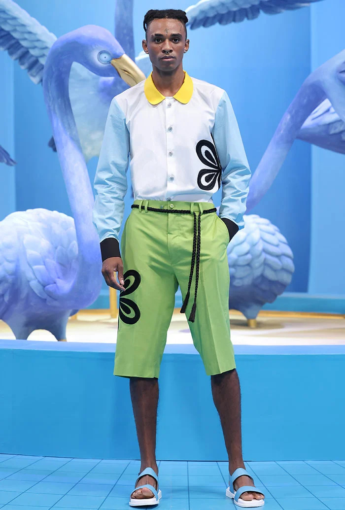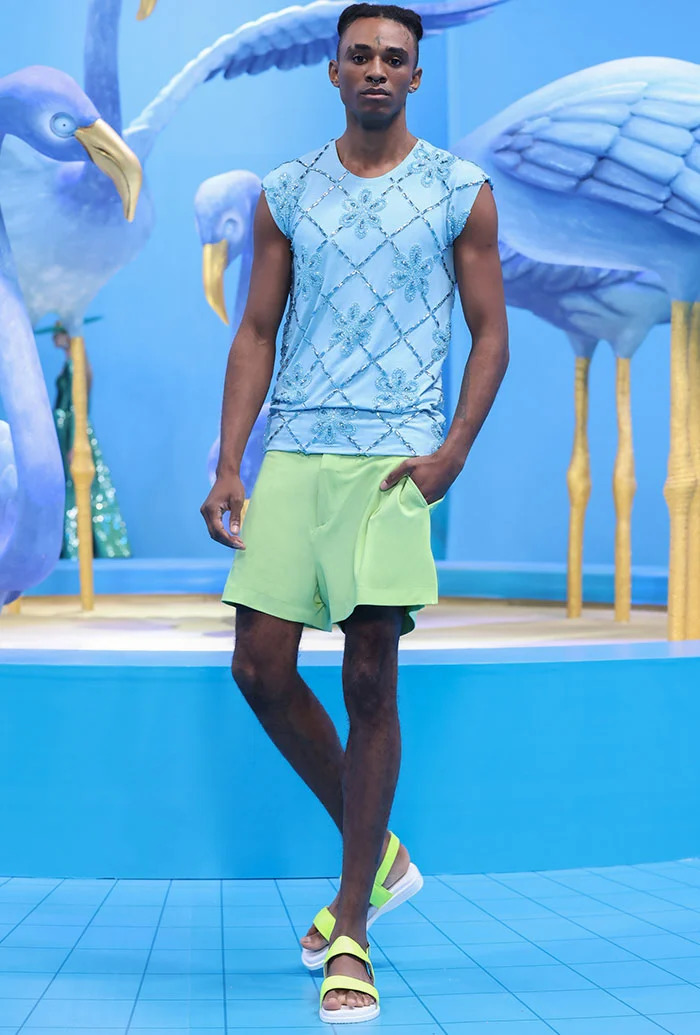بالنسبة للإطلالات الرجالية، فقد جمعت التصاميم ما بين الأسلوب الكاجويل العصري واللمسات الراقية التي تتميّز بها الدار، كالقميص المصنوع من مادّة الجورسيه باللون الأزرق السماوي، الذي زيّن بتطريزات الأزهار وأحجار الكريستال. كذلك، تم تنسيقها مع سروال قصير من القماش عينه.