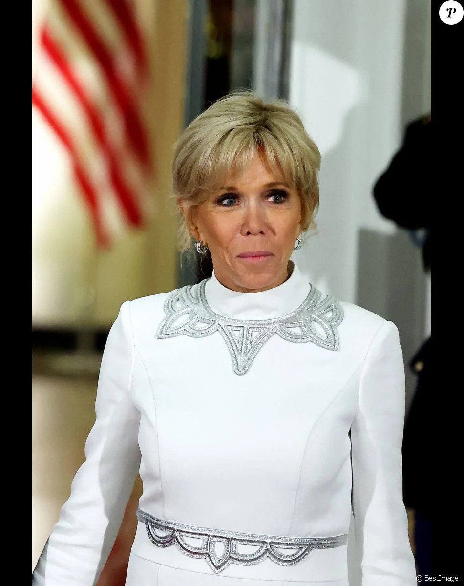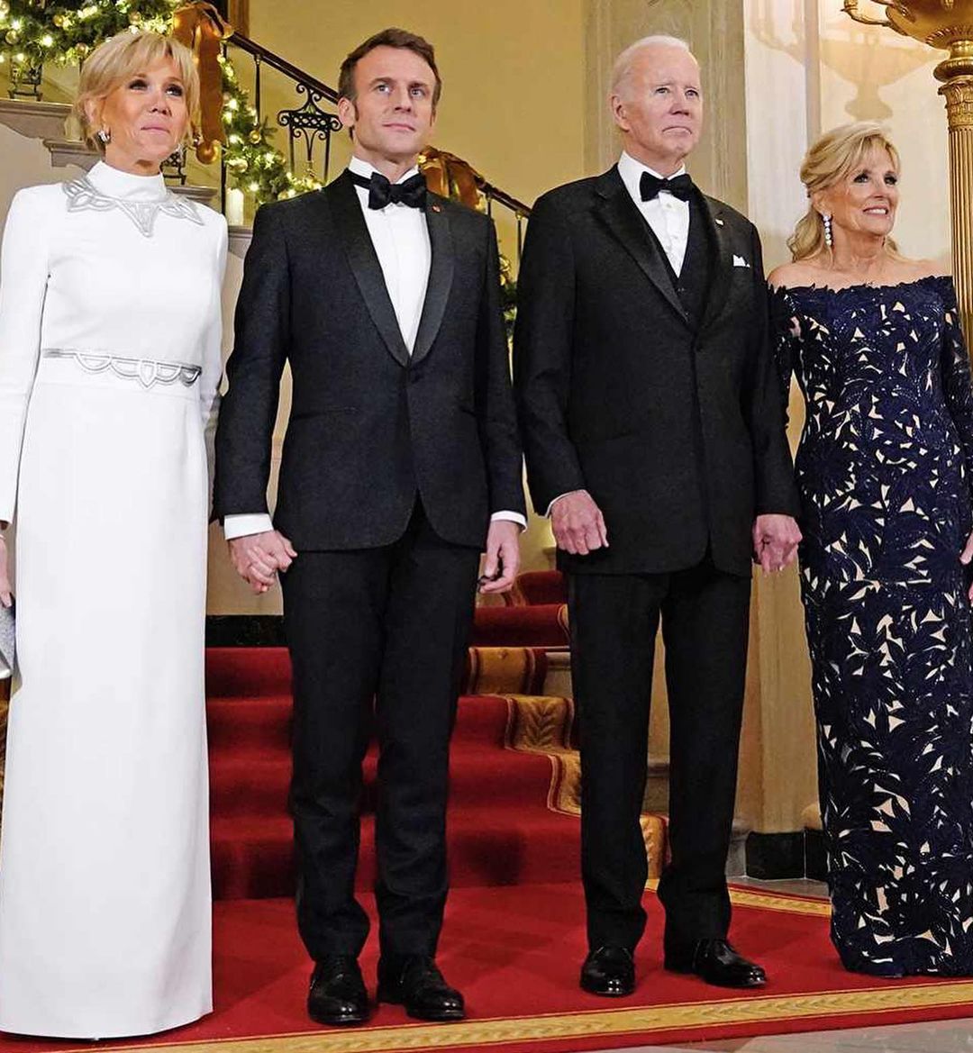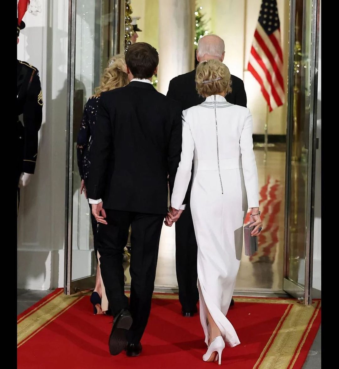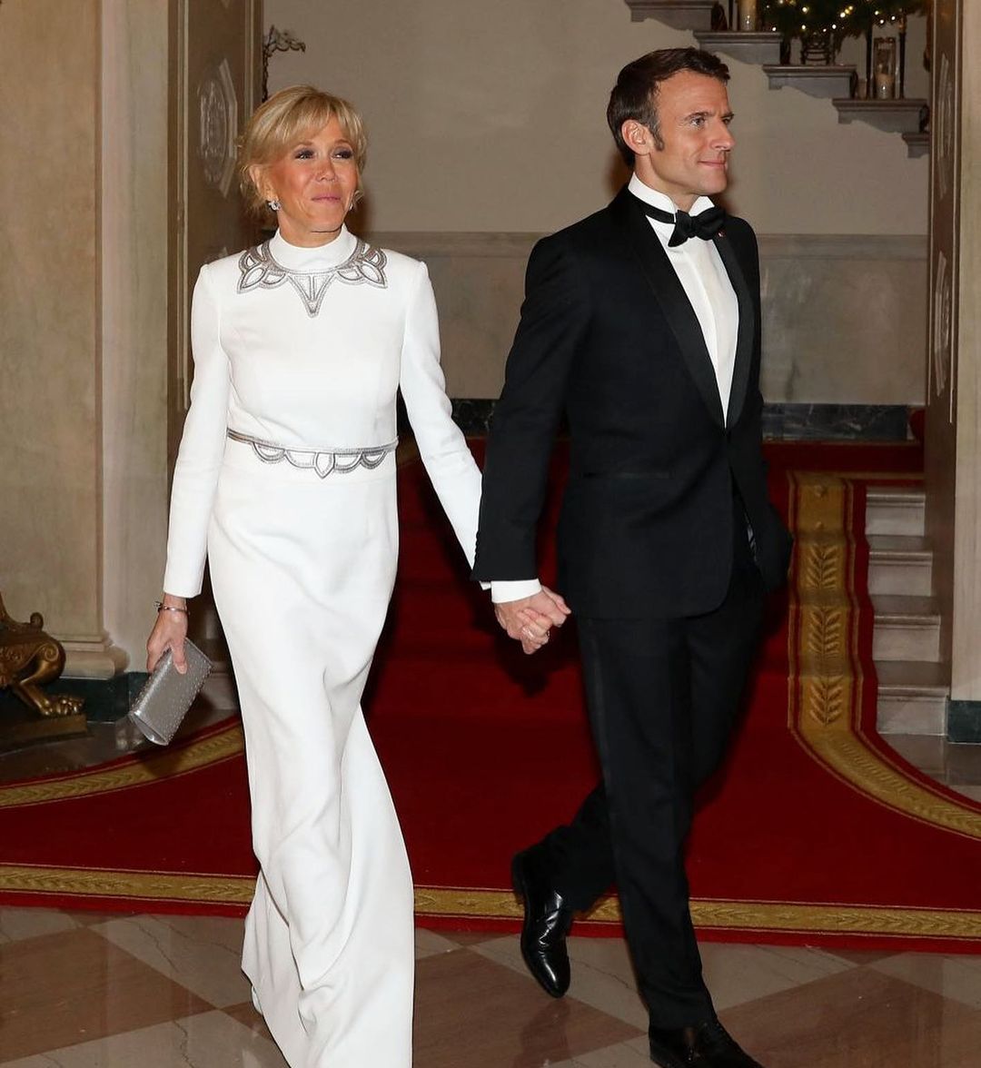 بريجيت ماكرون ولويس فويتون قصّة تدوم. في البيت الأبيض، حضرت السيّدة الفرنسيّة الأولى مرّة أخرى مع زوجها إيمانويل ماكرون. في نهاية رحلتهما التي استغرقت ثلاثة أيام إلى الولايات المتحدة، وتخلّلتها زيارة لوكالة ناسا، ومحادثات حول انتقال الطاقة، استقبل جو بايدن الزوجين ماكرون على مأدبة عشاء رسميّة. ولهذه المناسبة، ارتدت زوجة الرئيس الفرنسيّ فستاناً طويلاً أبيض نقيّاً مزيّناً بتفاصيل فضيّة عند الخصر، وحول العنق، الذي زيّن بياقة الثوب المعروفة في الخياطة الفرنسيّة بياقة col cheminée.