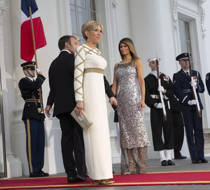 هو أسلوب رأيناه سابقاً، أثناء الزيارة التي قام بها الرئيس الفرنسي وزوجته إلى الولايات المتحدة الأميركيّة في 24 نيسان 2018 على مأدبة العشاء التي أقامها دونالد ترامب على شرفهما. يومها، اختارت بريجيت ماكرون فستاناً مشابهاً، من توقيع لويس فويتون أيضاً، كان طويلاً ومشقوقاً بالطول، مع تطريز على الحزام والياقة والأكمام، ولكن باللون الذهبيّ.