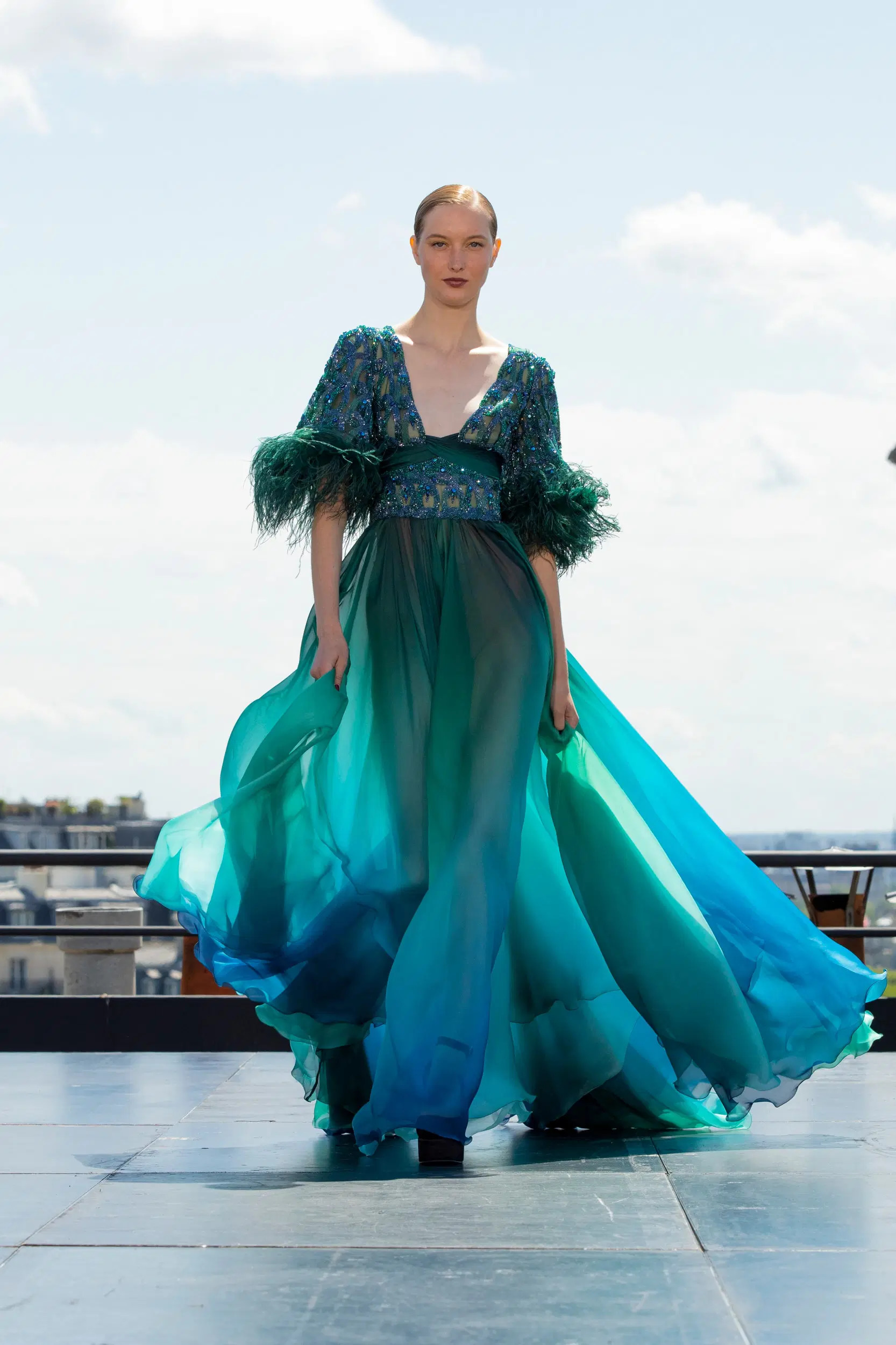 نعم هذا صحيح، ركّزنا كثيراً على الطبقات layers، نفّذنا طبقات من التول ومن الدانتيل ومن التويد كما استعملنا نوعاً جديداً من الأورغنزا، الريش الذي ترينه على القطع تمّ تلوينه يدويّاً.