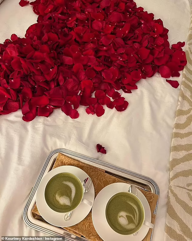 عرضت مشروبات الماتشا على سرير مليء ببتلات الورود الحمراء.