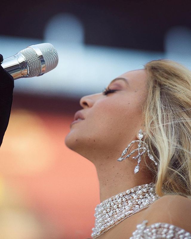 يُعزّز تأثير الزيّ القويّ اللؤلؤُ المرصّع على الديكولتيه الذي بدا كالجواهر. كذلك، أبرزت القصّة على الكتفين جاذبيّة الإطلالة، وأضفت سلاسل الخرز التي تزيّن الظهر الكثير من الرونق على الفستان. من حيث الأكسسوارات، دمجت بيونسيه الزيّ بقفّازات opera سوداء، وزيّنت أذنيها بأقراط متدليّة من السواروفسكي.